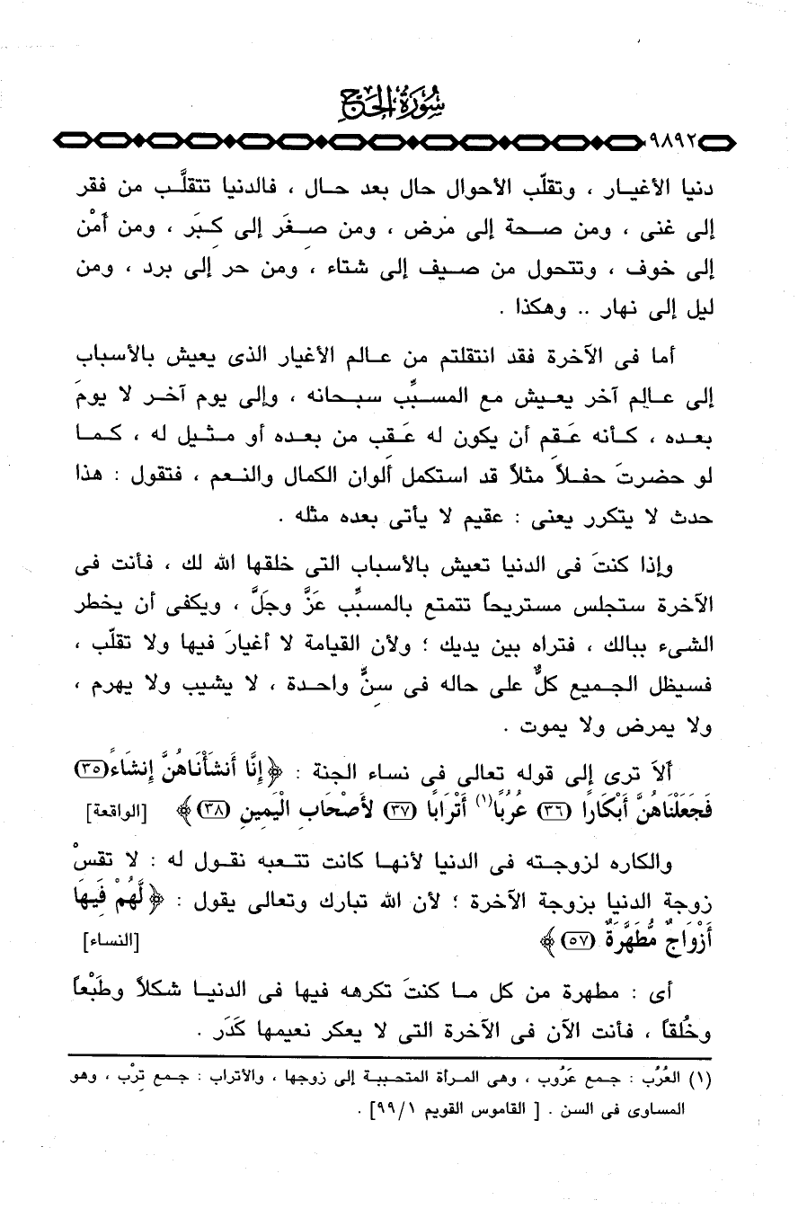 ألاَ ترى إلى قوله تعالى في نساء الجنة: {إِنَّآ أَنشَأْنَاهُنَّ إِنشَآءً فَجَعَلْنَاهُنَّ أَبْكَاراً عُرُباً أَتْرَاباً لأَصْحَابِ اليمين} [الواقعة: 35 - 38] .
