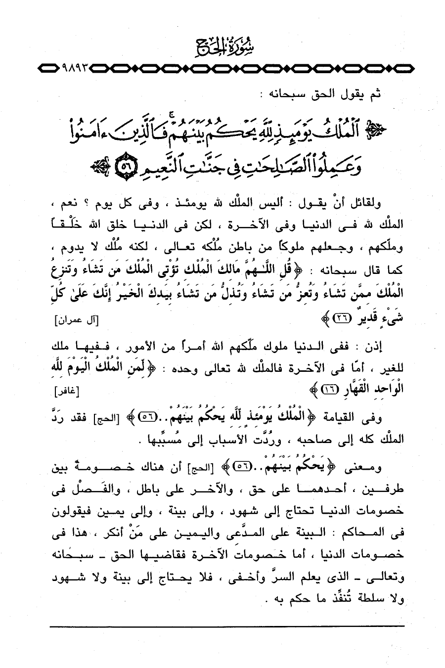 ومعنى {يَحْكُمُ بَيْنَهُمْ. .} [الحج: 56] أن هناك خصومةً بين طرفين، أحدهما على حق، والآخر على باطل، والفَصْل في خصومات الدنيا تحتاج إلى شهود، وإلى بينة، وإلى يمين فيقولون في المحاكم: البينة على المدَّعي واليمين على مَنْ أنكر، هذا في خصومات الدنيا، أما خصومات الآخرة فقاضيها الحق - سبحانه وتعالى - الذي يعلم السرَّ وأخفى، فلا يحتاج إلى بينة ولا شهود ولا سلطة تُنفِّذ ما حكم به.
