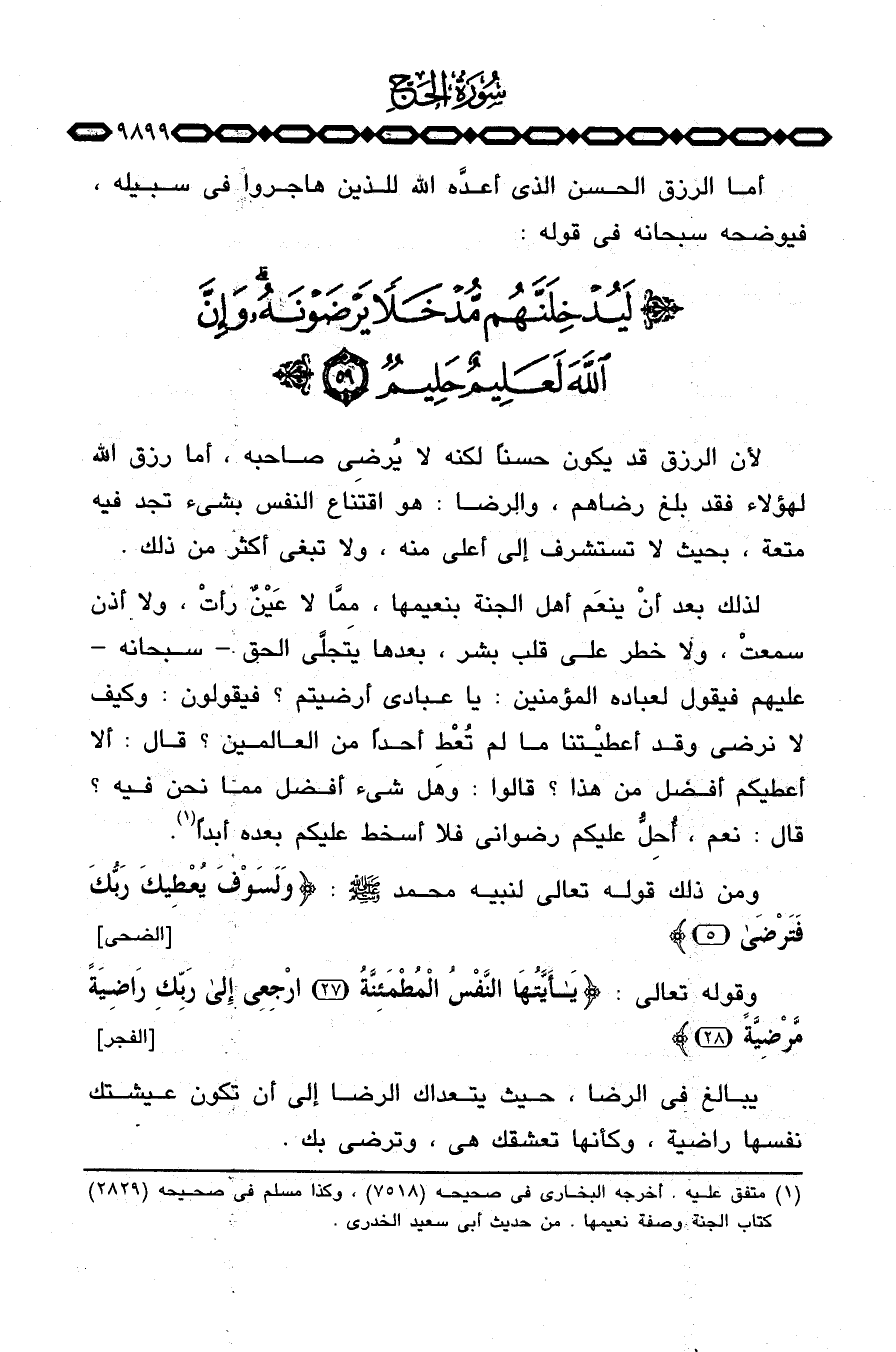 لذلك بعد أنْ ينعَم أهل الجنة بنعيمها، مِمَّا لا عَيْنٌ رأتْ، ولا أذن سمعتْ، ولا خطر على قلب بشر، بعدها يتجلَّى الحق - سبحانه - عليهم فيقول لعباده المؤمنين: يا عبادي أرضيتم؟ فيقولون: وكيف لا نرضى وقد أعطيْتنا ما لم تُعْطِ أحداً من العالمين؟ قال: ألا أعطيكم أفضل من هذا؟ قالوا: وهل شيء أفضل مما نحن فيه؟ قال: نعم، أُحِلُّ عليكم رضواني فلا أسخط عليكم بعده أبداً.