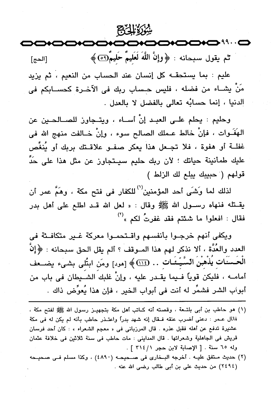 لذلك «لما وَشَى أحد المؤمنين للكفار في فتح مكة، وهَمَّ عمر أن يقتله فنهاه رسول الله صَلَّى اللَّهُ عَلَيْهِ وَسَلَّم َ وقال: لعل الله قد اطلع على أهل بدر فقال: افعلوا ما شئتم فقد غفرتُ لكم» .