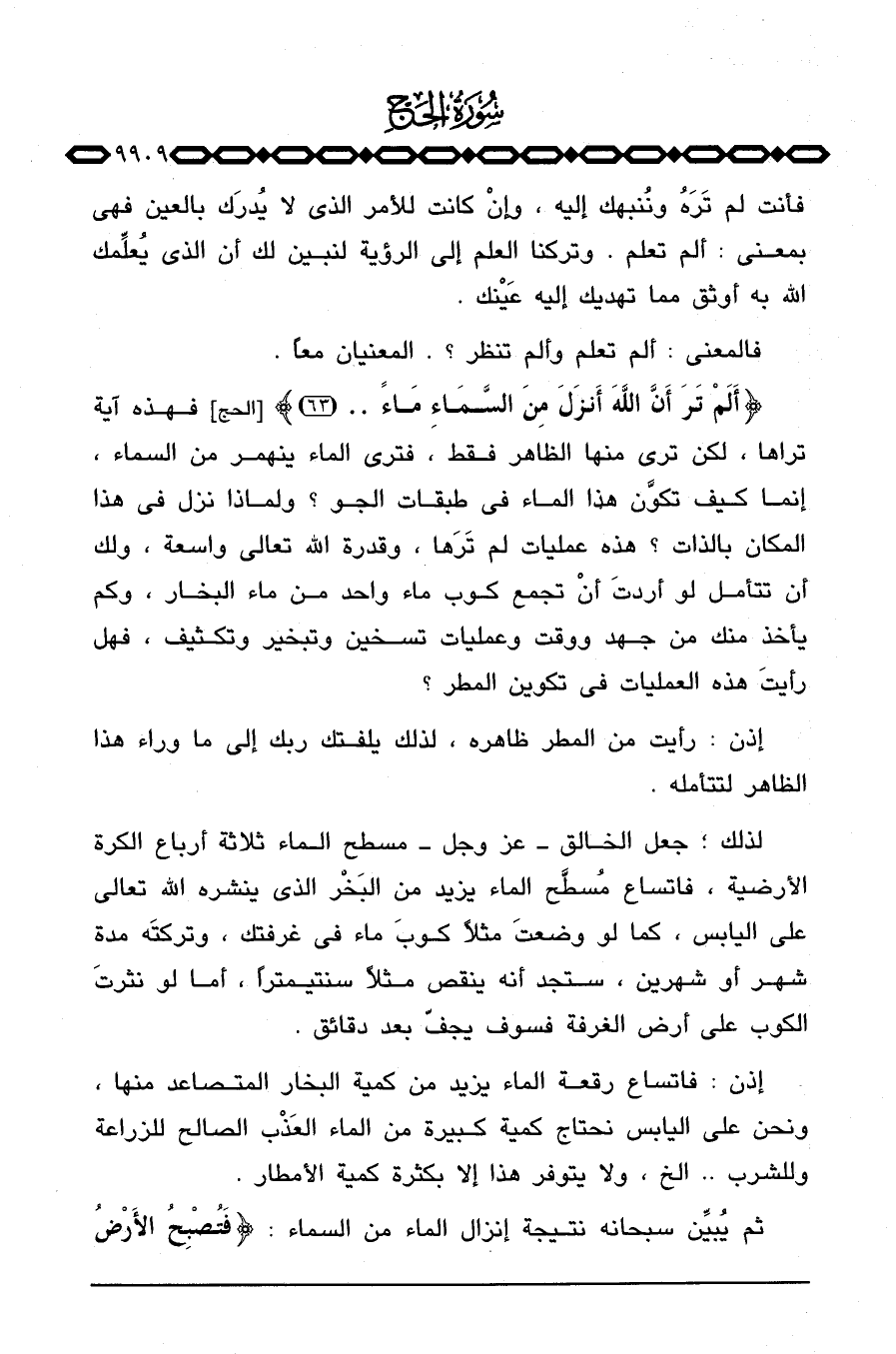 {أَلَمْ تَرَ أَنَّ الله أَنزَلَ مِنَ السمآء مَآءً. .} [الحج: 63] فهذه آية تراها، لكن ترى منها الظاهر فقط، فترى الماء ينهمر من السماء، إنما كيف تكَّون هذا الماء في طبقات الجو؟ ولماذا نزل في هذا المكان بالذات؟ هذه عمليات لم تَرَها، وقدرة الله تعالى واسعة، ولك أن تتأمل لو أردتَ أنْ تجمع كوب ماء واحد من ماء البخار، وكم يأخذ منك من جهد ووقت وعمليات تسخين وتبخير وتكثيف، فهل رأيتَ هذه العمليات في تكوين المطر؟