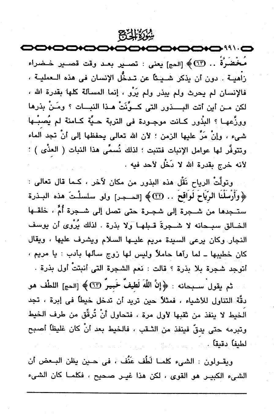 ثم يقول سبحانه: {إِنَّ الله لَطِيفٌ خَبِيرٌ} [الحج: 63] اللطْف هو دِقَّة التناول للأشياء، فمثلاً حين تريد أن تدخل خيطاً في إبرة، تجد الخيط لا ينفذ من ثقبها لأول مرة، فتحاول أنْ تُرفِّق من طرف الخيط وتبرمه حتى يدِقّ فينفذ من الثقب، فالخيط بعد أنْ كان غليظاً أصبح لطيفاً دقيقاً.