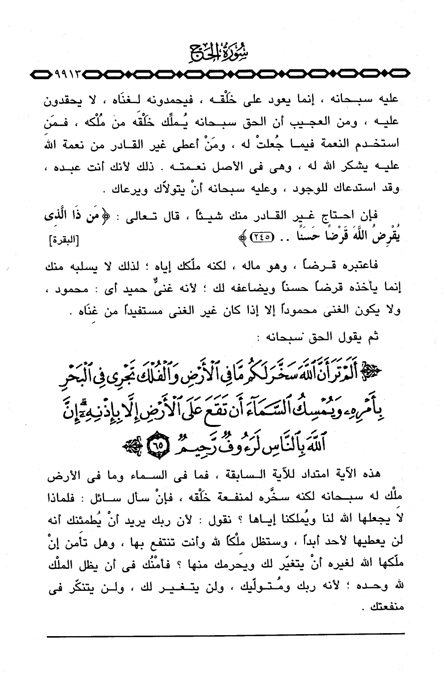عليه سبحانه، إنما يعود على خَلْقه، فيحمدونه لغنَاه، لا يحقدون عليه، ومن العجيب أن الحق سبحانه يُملِّك خَلْقَه من مُلْكه، فمَن استخدم النعمة فيما جُعلتْ له، ومَنْ أعطى غير القادر من نعمة الله عليه يشكر الله له، وهي في الأصل نعمته. ذلك لأنك أنت عبده، وقد استدعاك للوجود، وعليه سبحانه أنْ يتولاّك ويرعاك.