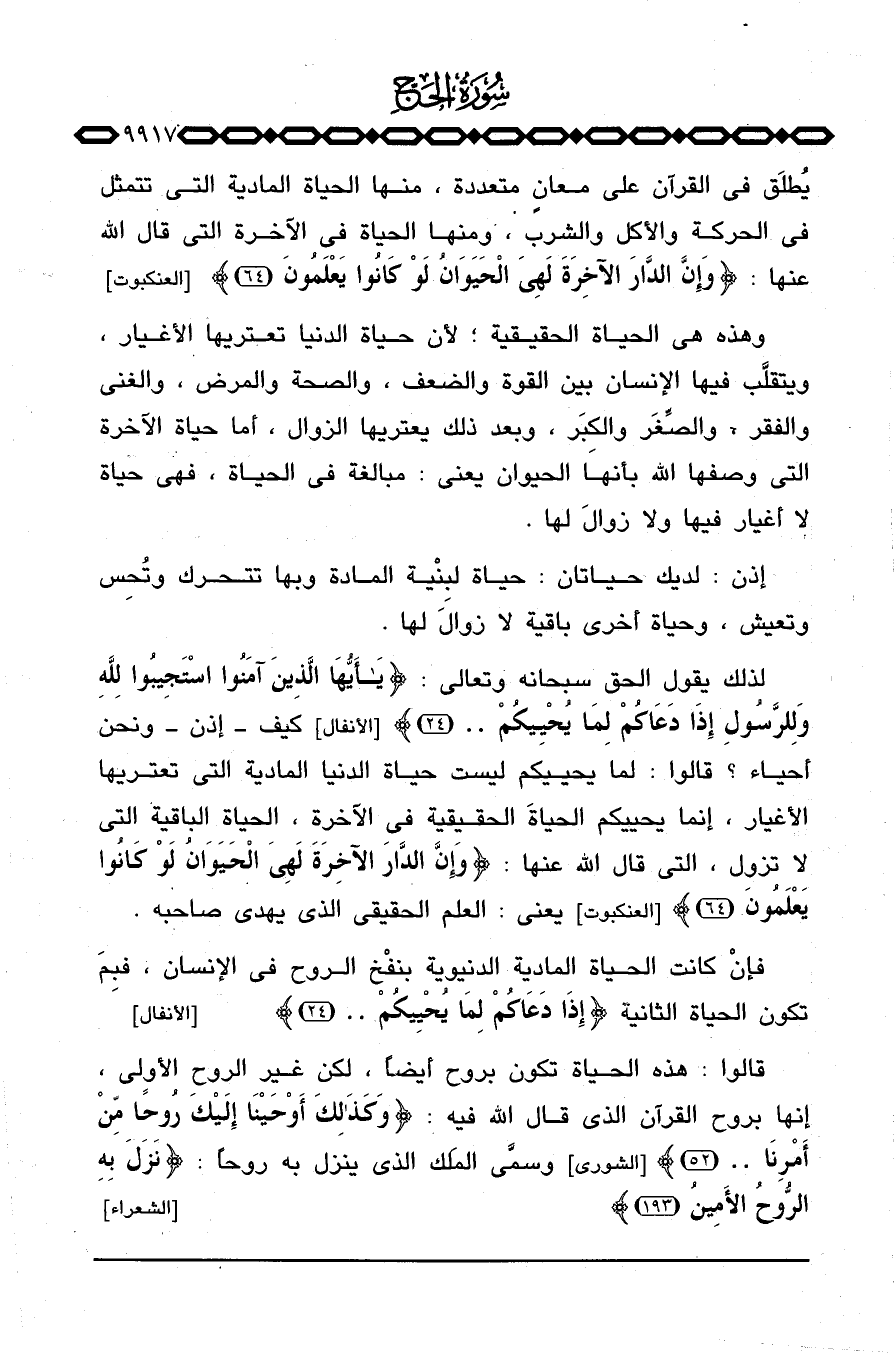 قالوا: هذه الحياة تكون بروح أيضاً، لكن غير الروح الأولى، إنها بروح القرآن الذي قال الله فيه: {وَكَذَلِكَ أَوْحَيْنَآ إِلَيْكَ رُوحاً مِّنْ أَمْرِنَا. .} [الشورى: 52] وسمَّى المَلك الذي ينزل به روحاً: {نَزَلَ بِهِ الروح الأمين} [الشعراء: 193] .