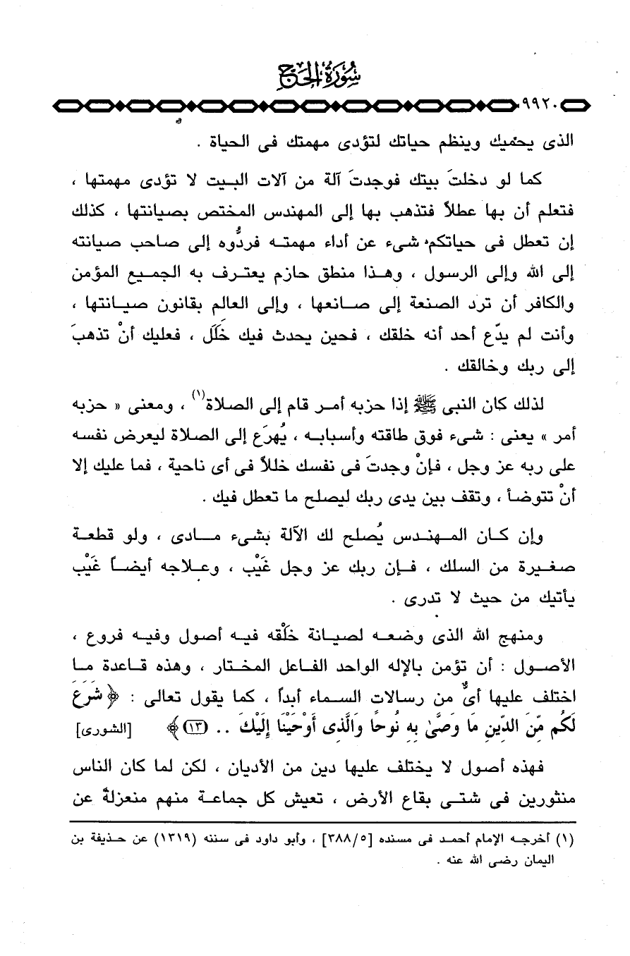 كما لو دخلتَ بيتك فوجدتَ آلة من آلات البيت لا تؤدي مهمتها، فتعلم أن بها عطلاً فتذهب بها إلى المهندس المختص بصيانتها، كذلك إن تعطل في حياتكم شيء عن أداء مهمته فردُّوه إلى صاحب صيانته إلى الله وإلى الرسول، وهذا منطق حازم يعترف به الجميع المؤمن والكافر أن ترد الصنعة إلى صانعها، وإلى العالِم بقانون صيانتها، وأنت لم يدّع أحد أنه خلقك، فحين يحدث فيك خَلَل، فعليك أنْ تذهبَ إلى ربك وخالقك.