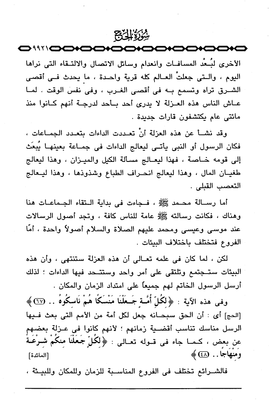 أما رسالة محمد صَلَّى اللَّهُ عَلَيْهِ وَسَلَّم َ، فجاءت في بداية التقاء الجماعات هنا وهناك، فكانت رسالته صَلَّى اللَّهُ عَلَيْهِ وَسَلَّم َ عامة للناس كافة، وتجد أصول الرسالات عند موسى وعيسى ومحمد عليهم الصلاة والسلام أصولاً واحدة، أمّا الفروع فتختلف باختلاف البيئات.
