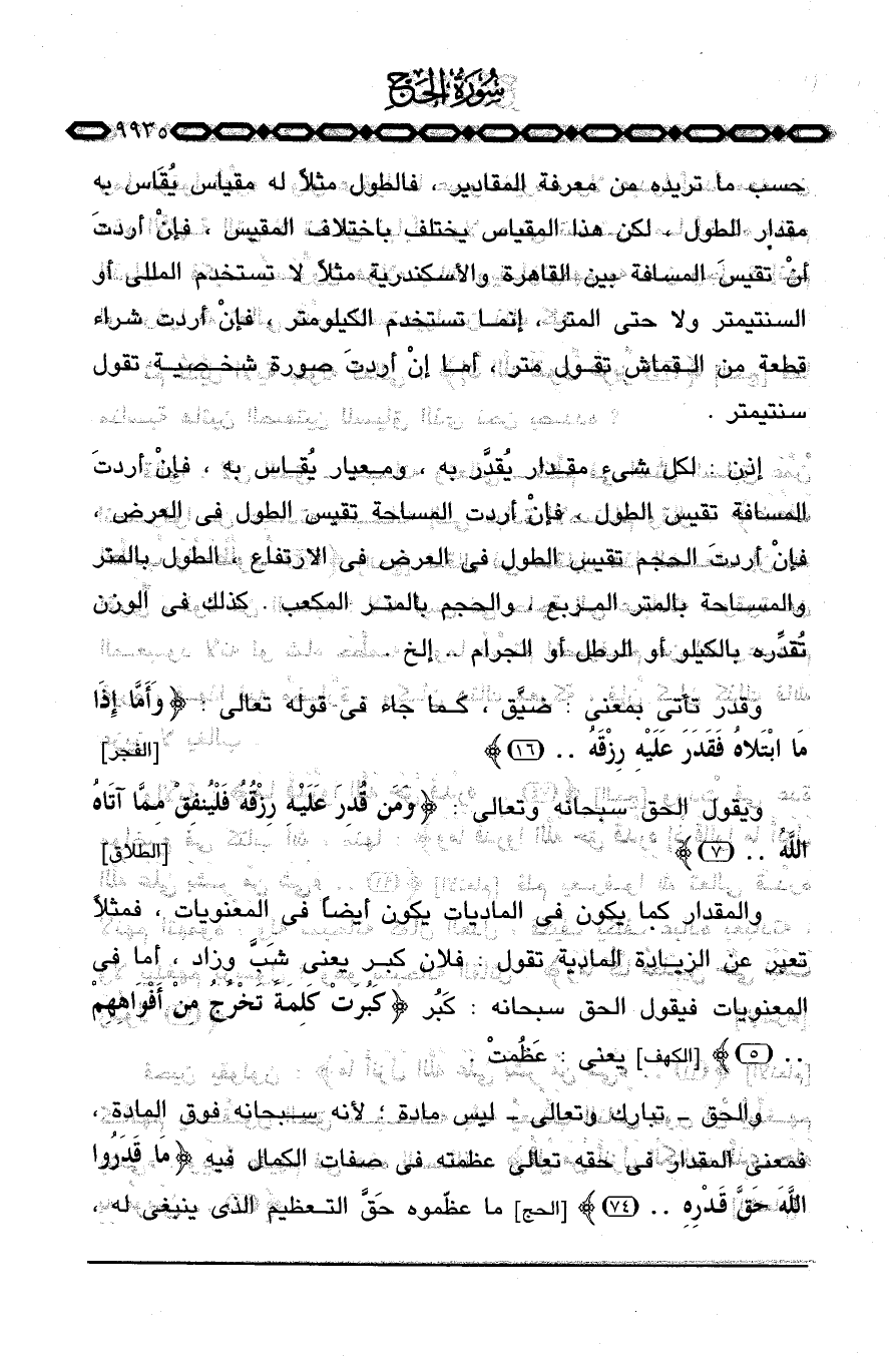إذن: لكل شيء مقدار يُقدَّر به، ومعيار يُقاس به، فإنْ أردتَ المسافة تقيس الطول، فإنْ أردت المساحة تقيس الطول في العرض، فإنْ أردتَ الحجم تقيس الطول في العرض في الارتفاع، الطول بالمتر والمساحة بالمتر المربع، والحجم بالمتر المكعب. كذلك في الوزن تُقدِّره بالكيلو أو الرطل أو الجرام. . إلخ.