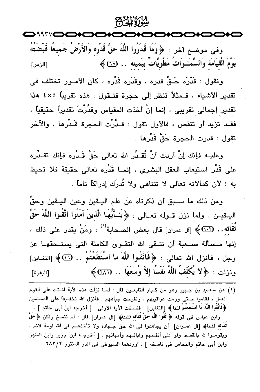 ومن ذلك ما سبق أن ذكرناه عن علم اليقين وعين اليقين وحقِّ اليقين. ولما نزل قوله تعالى: {ياأيها الذين آمَنُواْ اتقوا الله حَقَّ تُقَاتِهِ. .} [آل عمران: 102] قال بعض الصحابة: ومَنْ يقدر على ذلك إنها مسألة صعبة أن نتقي الله التقوى الكاملة التي يستحقها عَزَّ وَجَلَّ، فأنزل الله تعالى: {فاتقوا الله مَا استطعتم. .} [التغابن: 16] ونزلت: {لاَ يُكَلِّفُ الله نَفْساً إِلاَّ وُسْعَهَا. .} [البقرة: 286] .