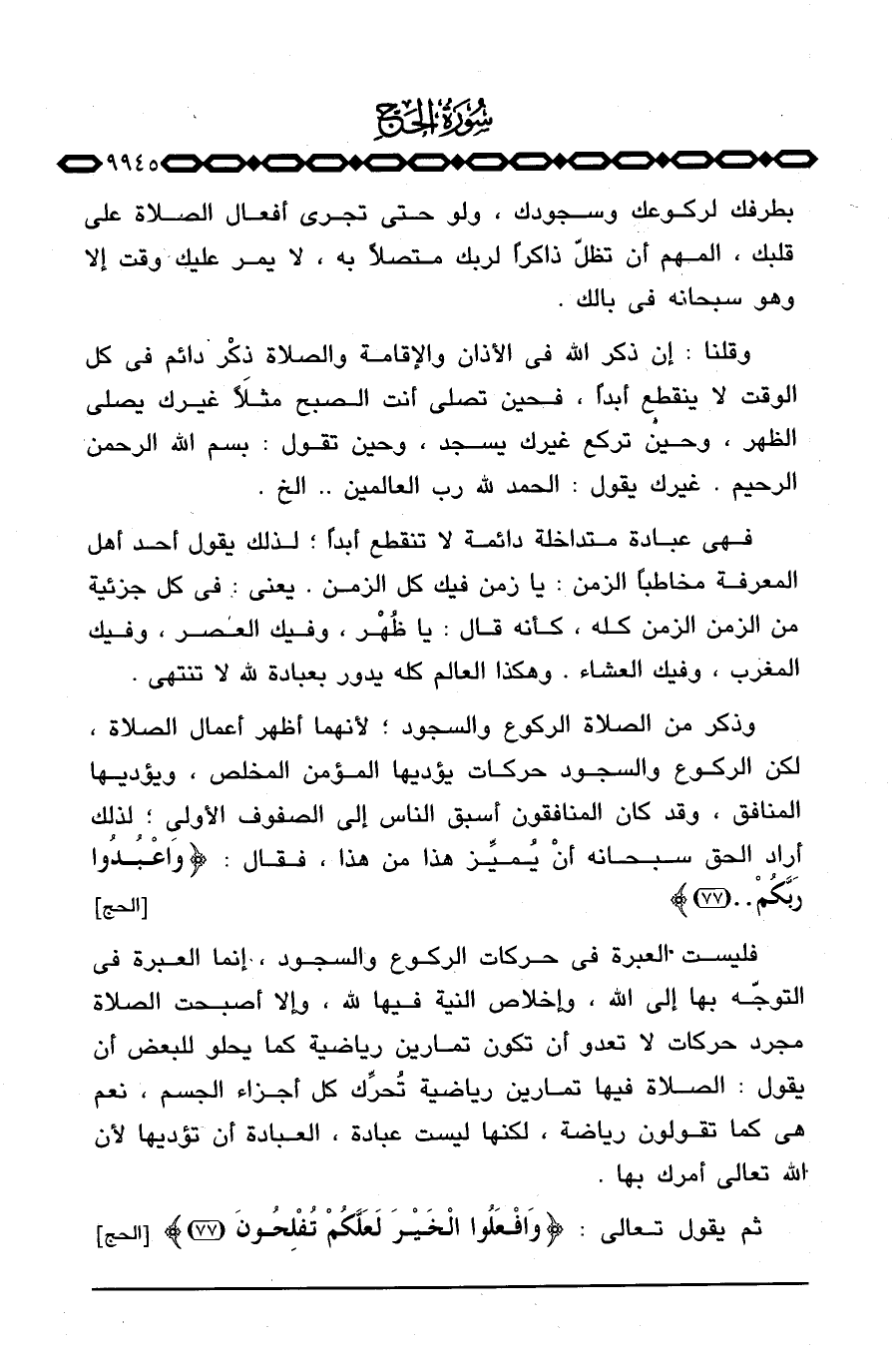 فليست العبرة في حركات الركوع والسجود، إنما العبرة في التوجّه بها إلى الله، وإخلاص النية فيها لله، وإلا أصبحت الصلاة مجرد حركات لا تعدو أن تكون تمارين رياضية كما يحلو للبعض أن يقول: الصلاة فيها تمارين رياضية تُحرِّك كل أجزاء الجسم، نعم هي كما تقولون رياضة، لكنها ليست عبادة، العبادة أن تؤديها لأن الله تعالى أمرك بها.