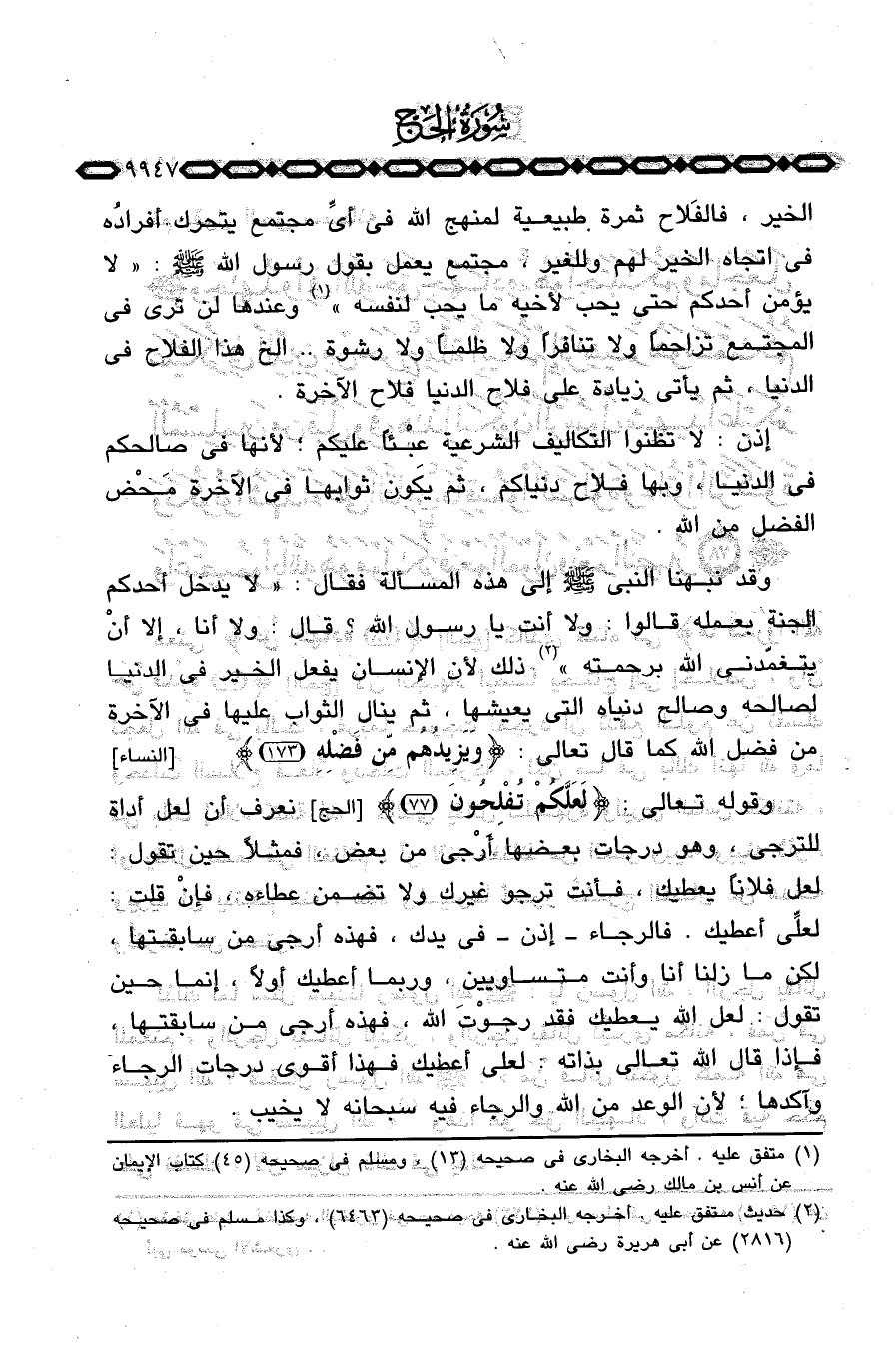 الخير، فالفَلاح ثمرة طبيعية لمنهج الله في أيِّ مجتمع يتحرك أفرادُه في اتجاه الخير لهم وللغير، مجتمع يعمل بقول رسول الله صَلَّى اللَّهُ عَلَيْهِ وَسَلَّم َ: «لا يؤمن أحدكم حتى يحب لأخيه ما يحب لنفسه» وعندها لن ترى في المجتمع تزاحماً ولا تنافراً ولا ظلماً ولا رشوة. . الخ هذا الفلاح في الدنيا، ثم يأتي زيادة على فلاح الدنيا فلاح الآخرة.