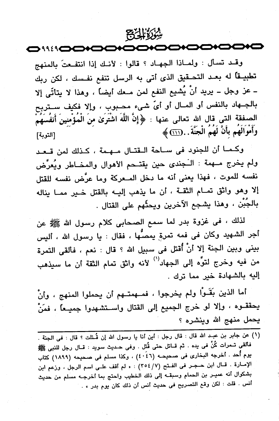 وقد تسأل: ولماذا الجهاد؟ قالوا: لأنك إذا انتفعتَ بالمنهج تطبيقاً له بعد التحقيق الذي أتى به الرسل تنفع نفسك، لكن ربك - عَزَّ وَجَلَّ - يريد أنْ يُشيع النفع لمن معك أيضاً، وهذا لا يتأتّى إلا بالجهاد بالنفس أو المال أو أي شيء محبوب، وإلا فكيف ستربح الصفقة التي قال الله تعالى عنها: {إِنَّ الله اشترى مِنَ المؤمنين أَنفُسَهُمْ وَأَمْوَالَهُمْ بِأَنَّ لَهُمُ الجنة. .} [التوبة: 111] .