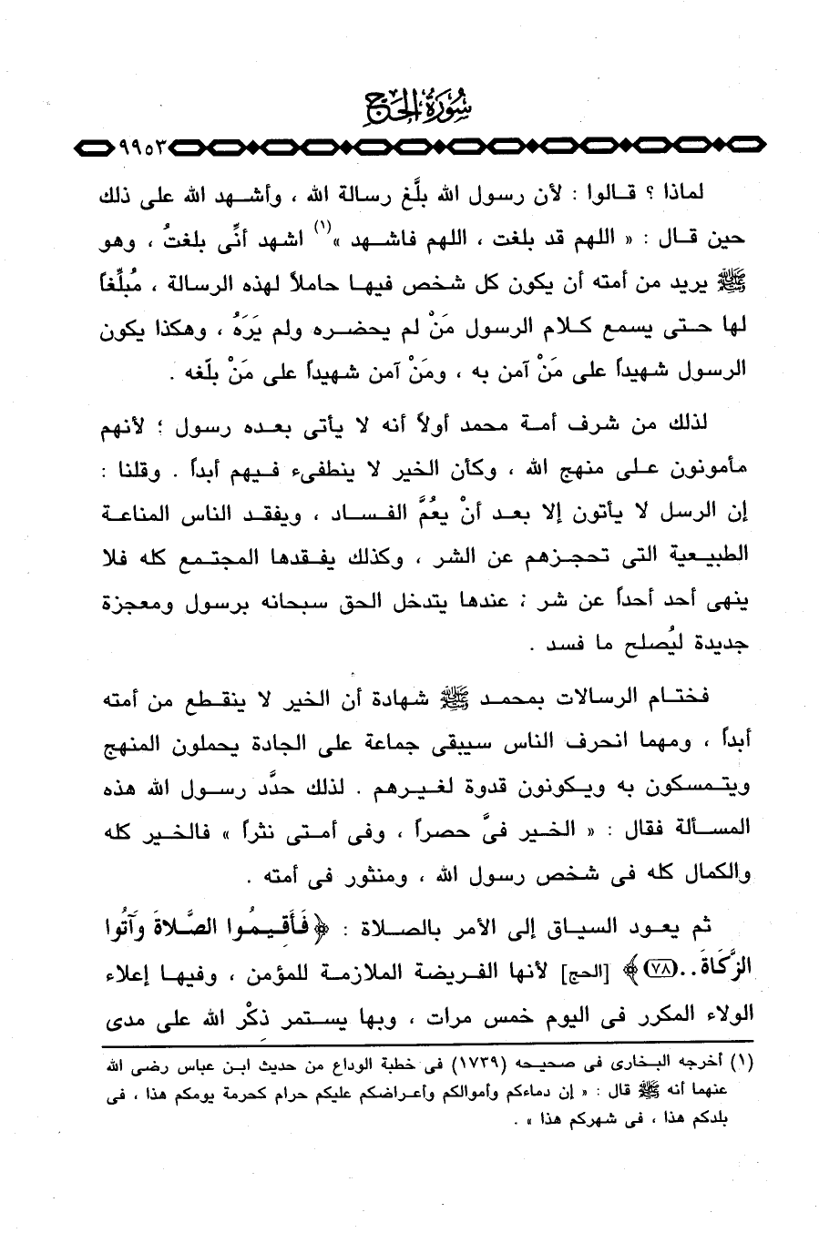 فختام الرسالات بمحمد صَلَّى اللَّهُ عَلَيْهِ وَسَلَّم َ شهادة أن الخير لا ينقطع من أمته أبداً، ومهما انحرف الناس سيبقى جماعة على الجادة يحملون المنهج ويتمسكون به ويكونون قدوة لغيرهم. لذلك حدَّد رسول الله هذه المسألة فقال: «الخير فيَّ حصراً، وفي أمتي نثراً» فالخير كله والكمال كله في شخص رسول الله، ومنثور في أمته.