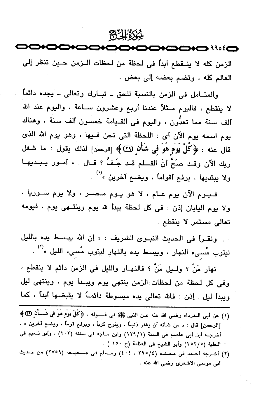 فيوم الآن يوم عام، لا هو يوم مصر، ولا يوم سوريا، ولا يوم اليابان إذن: في كل لحظة يبدأ لله يوم ينتهي يوم، فيومه تعالى مستمر لا ينقطع.