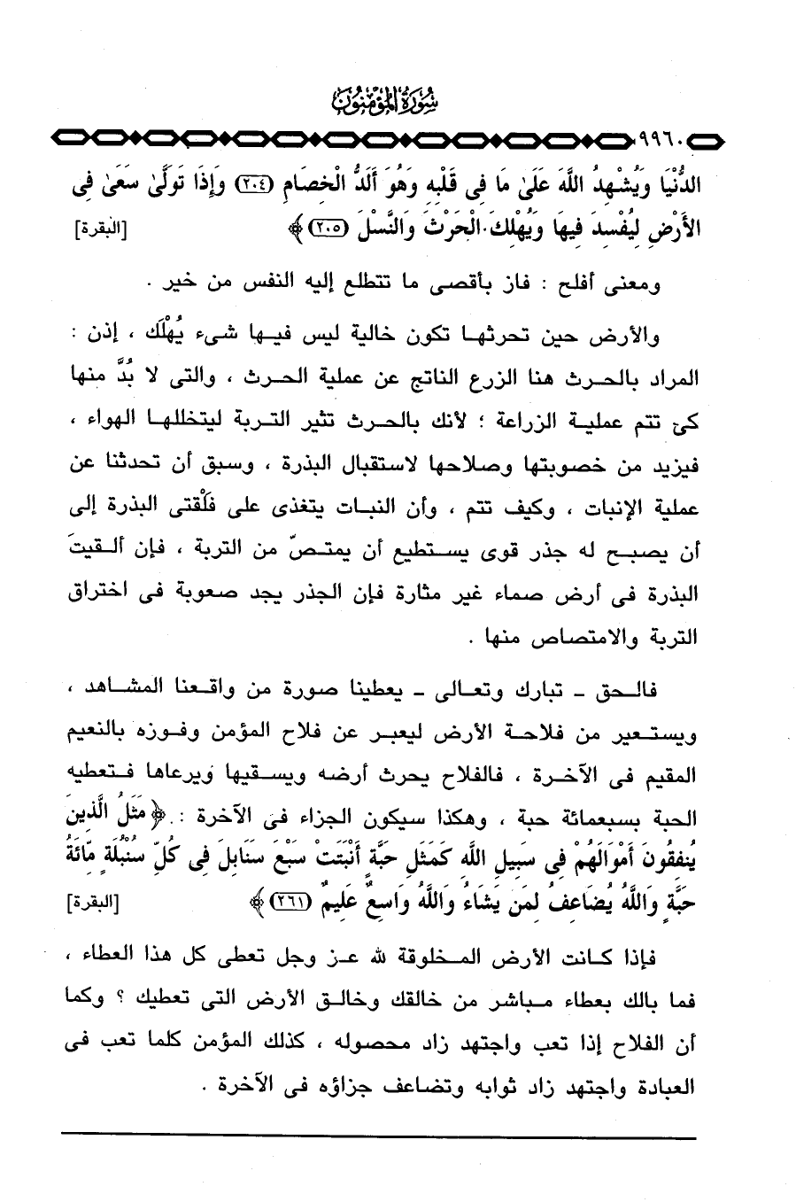 فالحق - تبارك وتعالى - يعطينا صورة من واقعنا المشاهد، ويستعير من فلاحة الأرض ليعبر عن فلاح المؤمن وفوزه بالنعيم المقيم في الآخرة، فالفلاح يحرث أرضه ويسقيها ويرعاها فتعطيه الحبة بسبعمائة حبة، وهكذا سيكون الجزاء في الآخرة: {مَّثَلُ الذين يُنْفِقُونَ أَمْوَالَهُمْ فِي سَبِيلِ الله كَمَثَلِ حَبَّةٍ أَنبَتَتْ سَبْعَ سَنَابِلَ فِي كُلِّ سُنبُلَةٍ مِّئَةُ حَبَّةٍ والله يُضَاعِفُ لِمَن يَشَآءُ والله وَاسِعٌ عَلِيمٌ} [البقرة: 261] .
