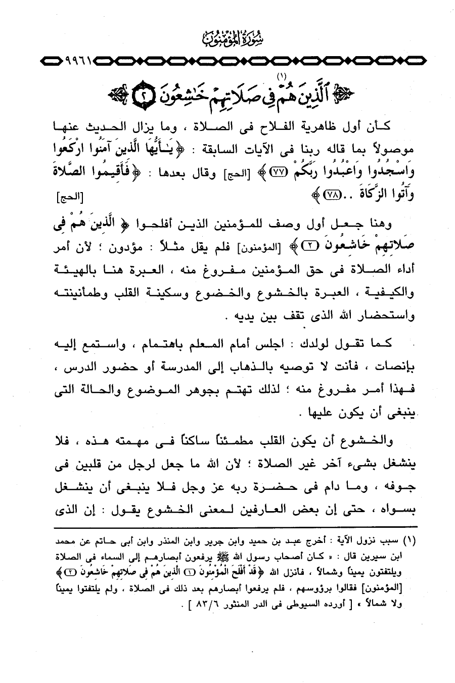 كان أول ظاهرية الفلاح في الصلاة، وما يزال الحديث عنها موصولاً بما قاله ربنا في الآيات السابقة: {ياأيها الذين آمَنُواْ اركعوا واسجدوا وَاعْبُدُواْ رَبَّكُمْ. .} [الحج: 77] وقال بعدها: {فَأَقِيمُواْ الصلاة وَآتُواْ الزكاة. .} [الحج: 78] .
