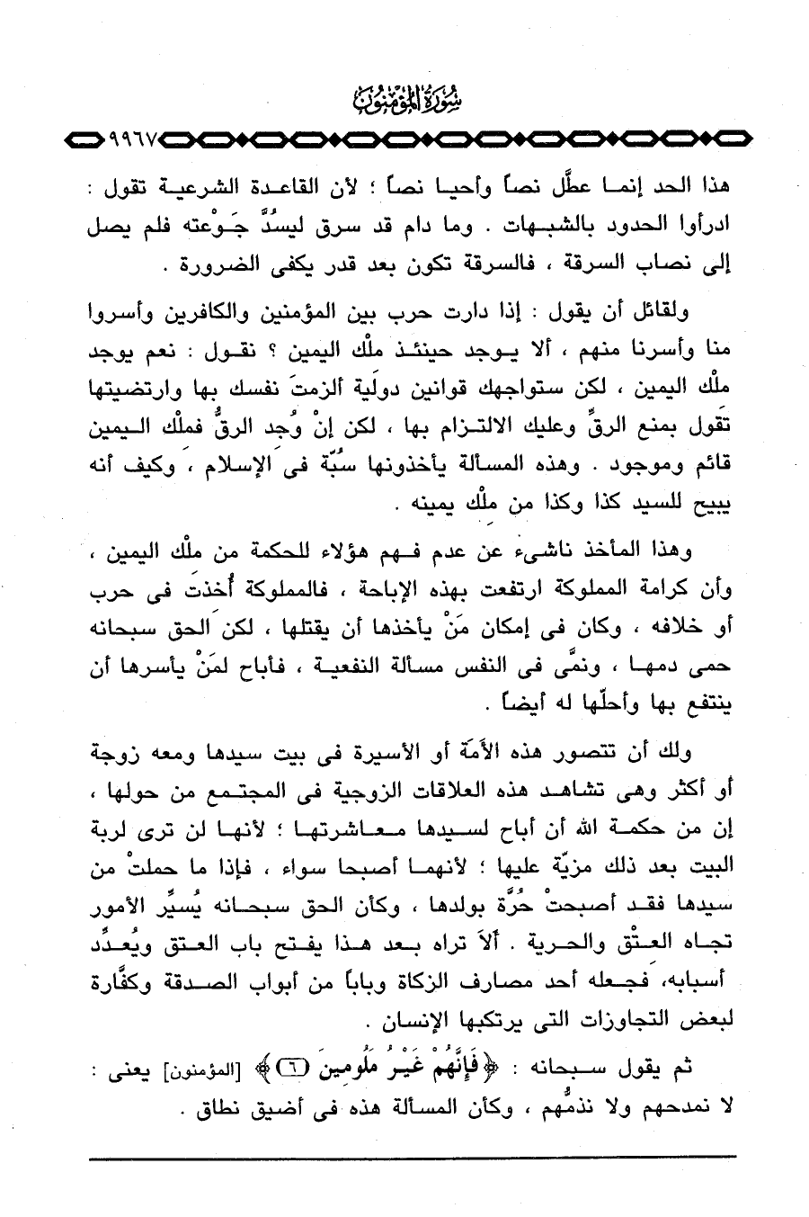 ولقائل أن يقول: إذا دارت حرب بين المؤمنين والكافرين وأسروا منا وأسرنا منهم، ألا يوجد حينئذ مِلْك اليمينِ؟ نقول: نعم يوجد مِلْك اليمين، لكن ستواجهك قوانين دولية ألزمتَ نفسك بها وارتضيتها تقول بمنع الرقِّ وعليك الالتزام بها، لكن إنْ وُجِد الرقُّ فمِلْك اليمين قائم وموجود. وهذه المسألة يأخونها سُبّة في الإسلام، وكيف أنه يبيح للسيد كذا وكذا من مِلْك يمينه.