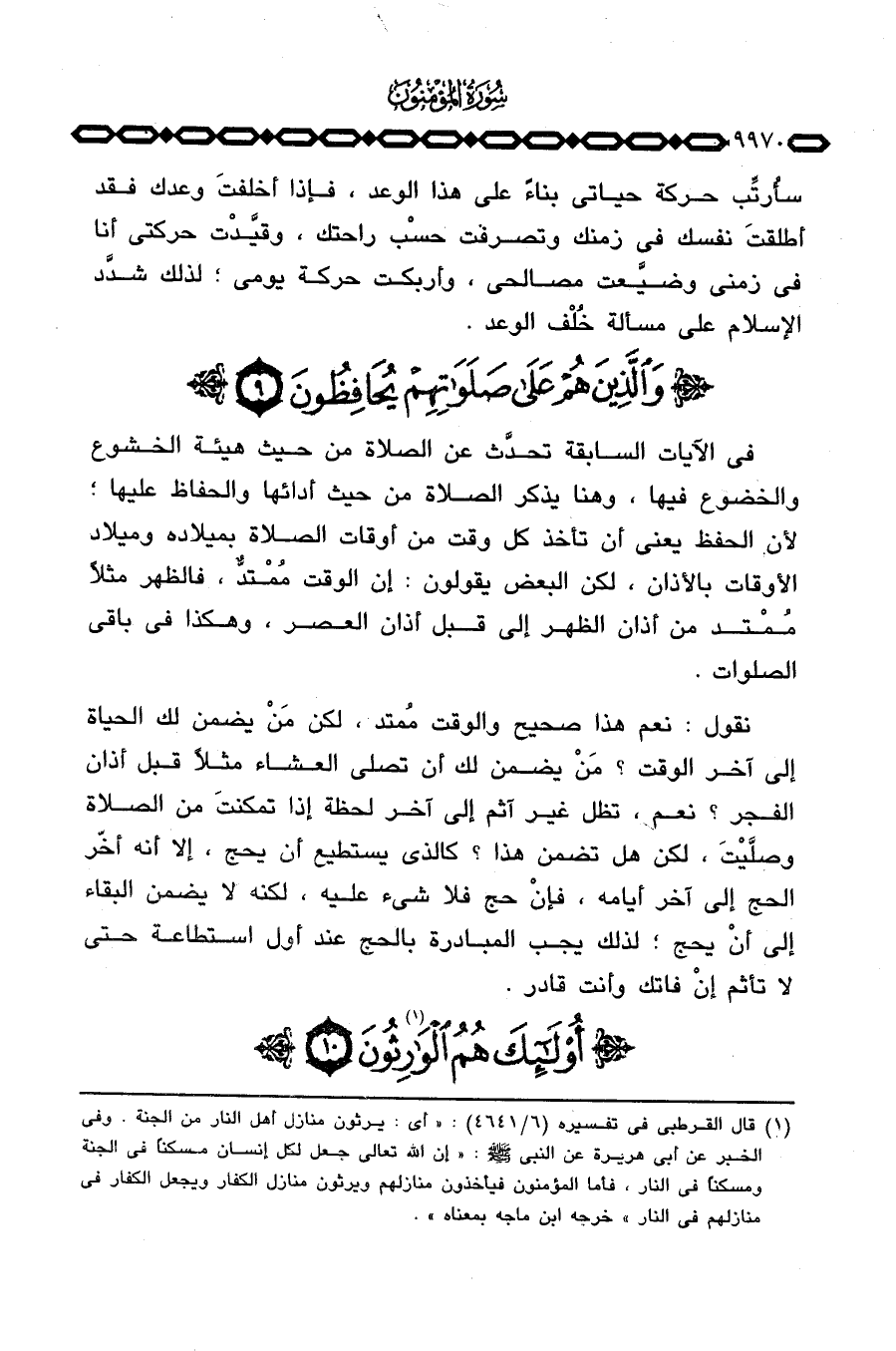 في الآيات السابقة تحدِّث عن الصلاة من حيث هيئة الخشوع والخضوع فيها، وهنا يذكر الصلاة من حيث أدائها والحفاظ عليها؛ لأن الحفظ يعني أن تأخذ كل وقت من أوقات الصلاة بميلاده وميلاد الأوقات بالأذان، لكن البعض يقولون: إن الوقت مُمْتدُّ، فالظهر مثلاً مُمْتد من أذان الظهر إلى قبل أذان العصر، وهكذا في باقي الصلوات.