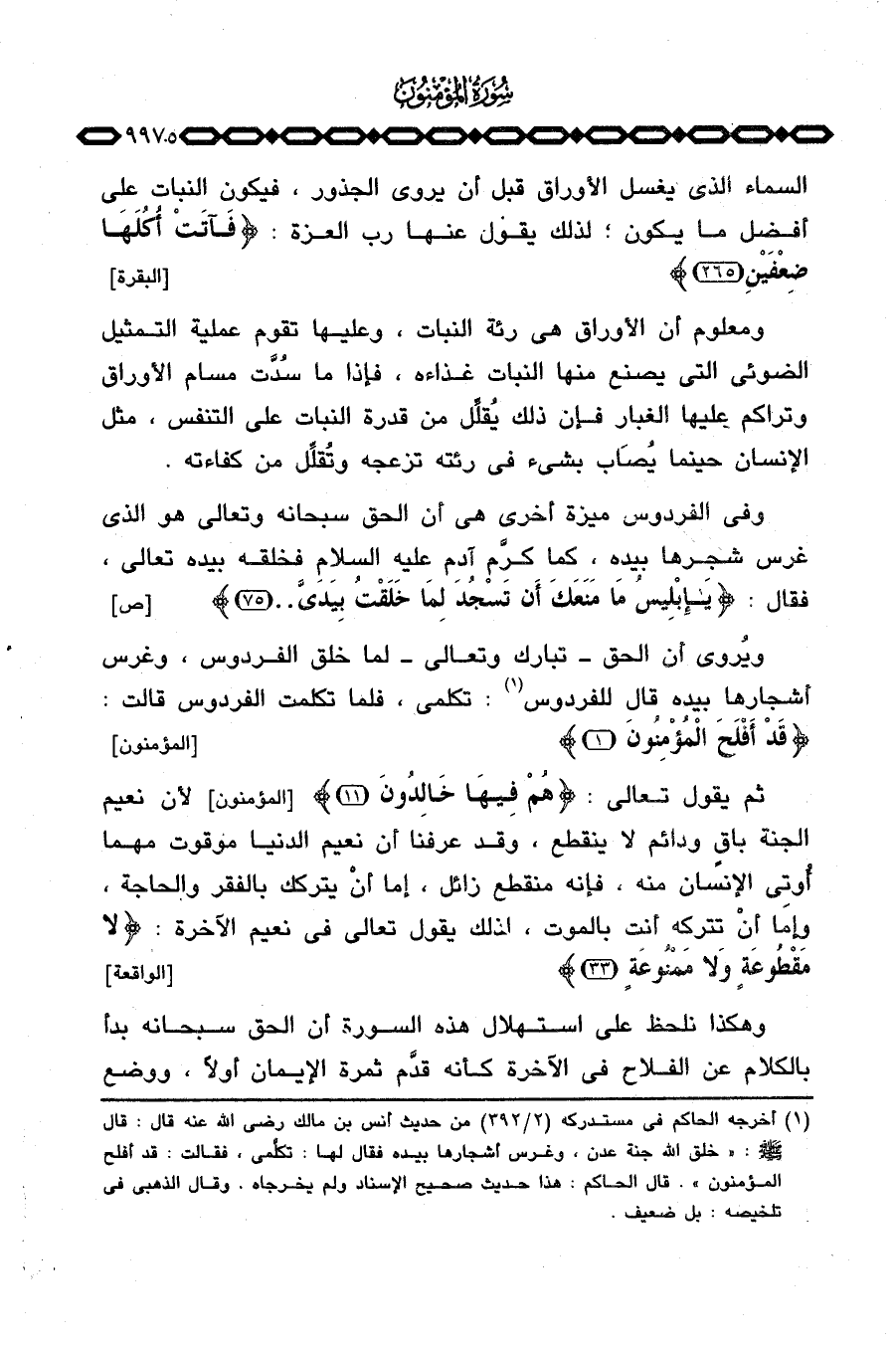 ويُروى أن الحق - تبارك وتعالى - لما خلق الفردوس، وغرس أشجارها بيده قال للفردوس: تكلمي، فلما تكلمت الفردوس قالت: {قَدْ أَفْلَحَ المؤمنون} [المؤمنون: 1] .