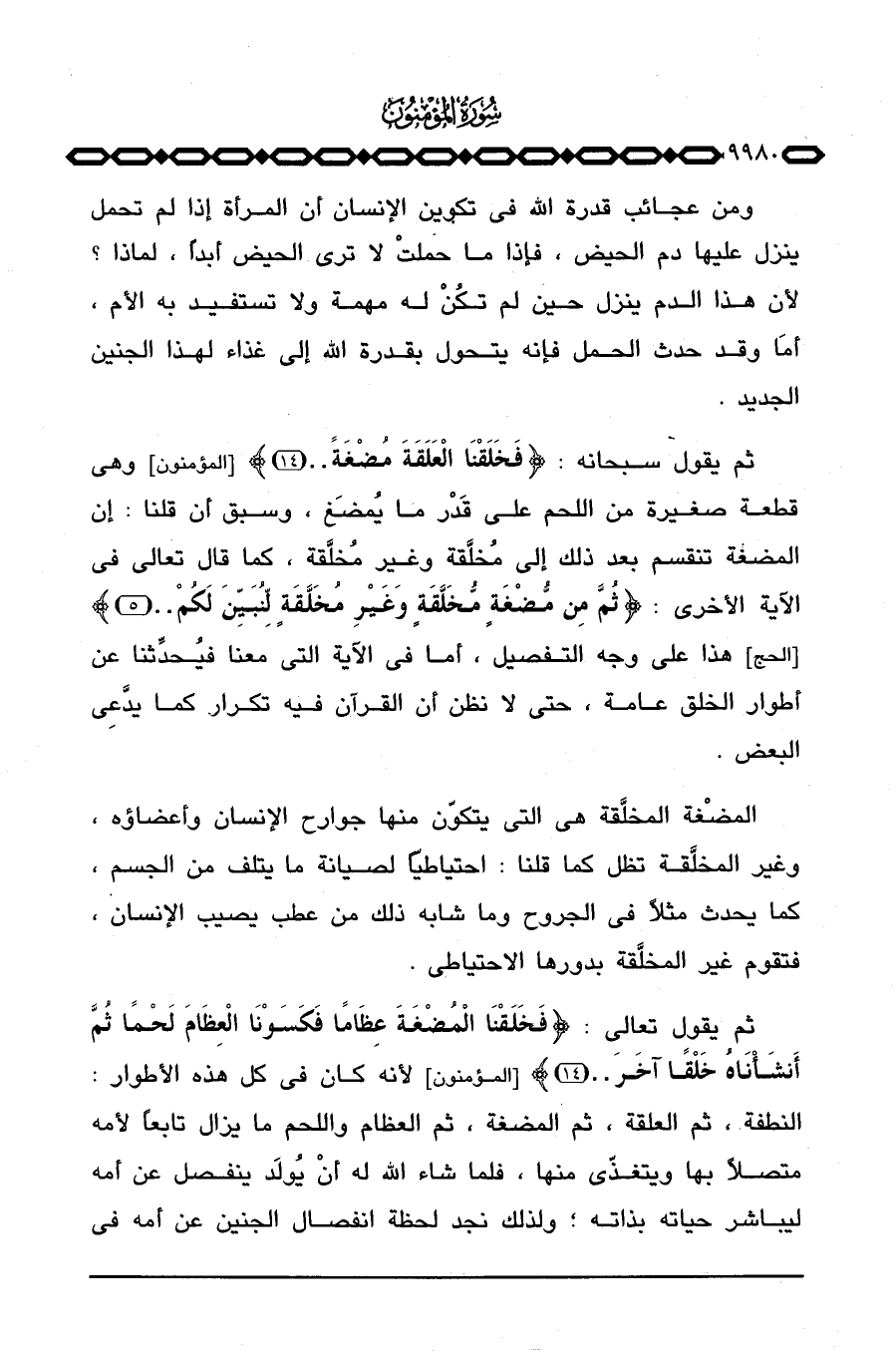 ثم يقول سبحانه: {فَخَلَقْنَا العلقة مُضْغَةً. .} [المؤمنون: 14] وهي قطعة صغيرة من اللحم على قَدْر ما يُمضَغ، وسبق أن قلنا: إن المضغة تنقسم بعد ذلك إلى مُخلَّقة وغير مُخلَّقة، كما قال تعالى في الآية الأخرى: {ثُمَّ مِن مُّضْغَةٍ مُّخَلَّقَةٍ وَغَيْرِ مُخَلَّقَةٍ لِّنُبَيِّنَ لَكُمْ. .} [الحج: 5] هذا على وجه التفصيل، أما في الآية التي معنا فيُحدِّثنا عن أطوار الخلق عامة، حتى لا نظن أن القرآن فيه تكرار كما يدَّعِي البعض.