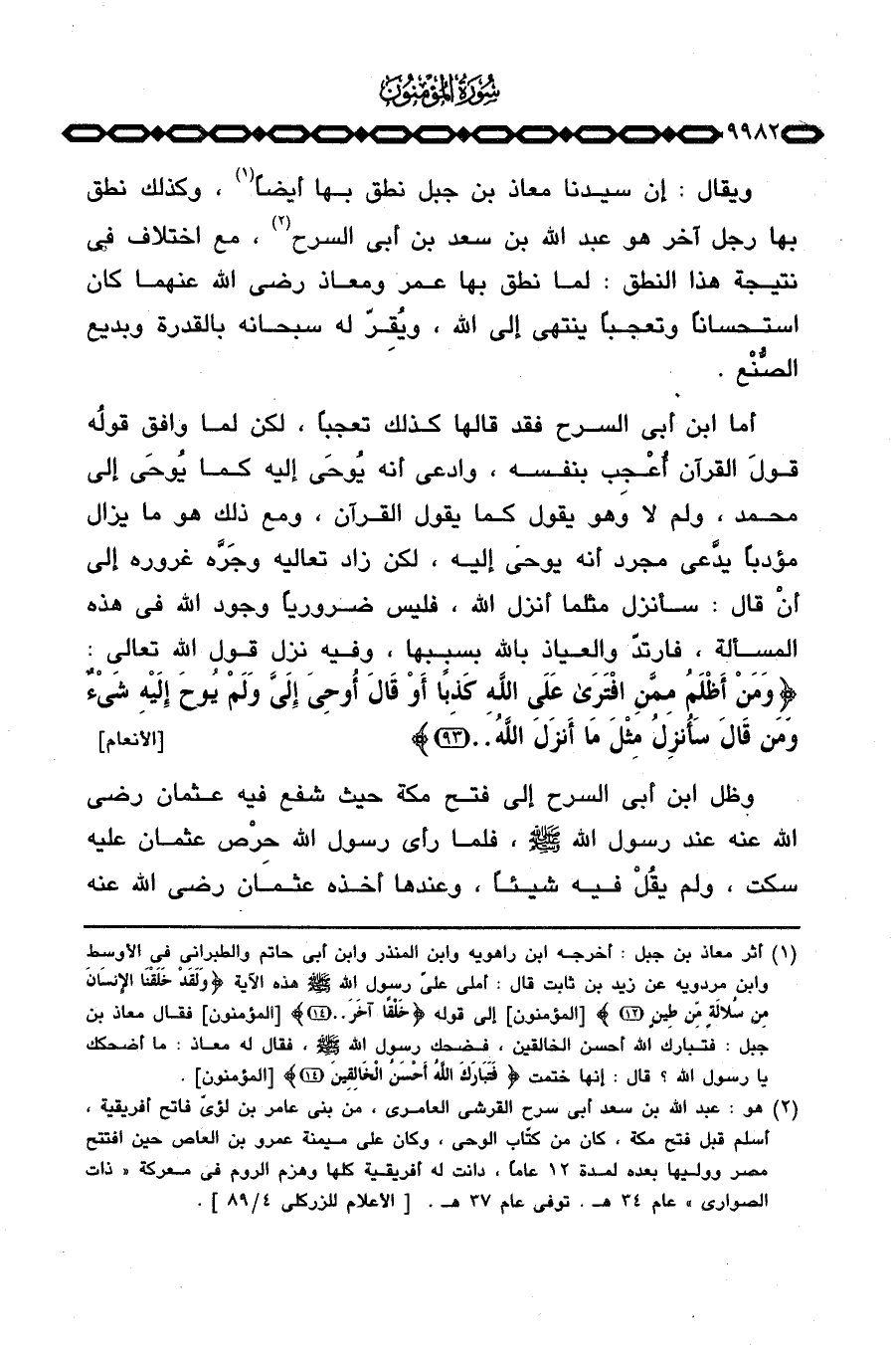 أما ابن أبي السرح فقد قالها كذلك تعجباً، لكن لما وافق قولُه قولَ القرآن أُعْجِب بنفسه، وادعى أنه يُوحَى إليه كما يُوحَى إلى محمد، ولم لا وهو يقول كما يقول القرآن، ومع ذلك هو ما يزال مؤدباً يدَّعي مجرد أنه يوحى إليه، لكن زاد تعاليه وجَرَّه غرور إلى أنْ قال: سأنزل مثلما أنزل الله، فليس ضرورياً وجود الله في هذه المسألة، فارتدّ والعياذ بالله بسببها، وفيه نزل قول الله تعالى: {وَمَنْ أَظْلَمُ مِمَّنِ افترى عَلَى الله كَذِباً أَوْ قَالَ أُوْحِيَ إِلَيَّ وَلَمْ يُوحَ إِلَيْهِ شَيْءٌ وَمَن قَالَ سَأُنزِلُ مِثْلَ مَآ أَنَزلَ الله. .} [الأنعام: 93] .