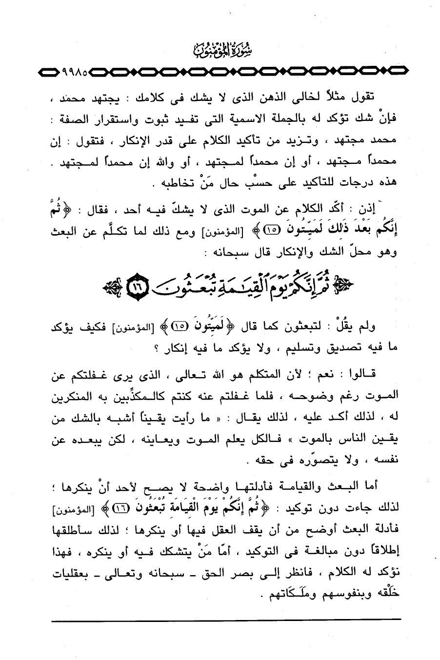 أما البعث والقيامة فأدلتها واضحة لا يصح لأحد أنْ ينكرها؛ لذلك جاءت دون توكيد: {ثُمَّ إِنَّكُمْ يَوْمَ القيامة تُبْعَثُونَ} [المؤمنون: 16] فأدلة البعث أوضح من أن يقف العقل فيها أو ينكرها؛ لذلك سأطلقها إطلاقاً دون مبالغة في التوكيد، أمّا مَنْ يتشكك فيه أو ينكره، فهذا نؤكد له الكلام، فانظر إلى بصر الحق - سبحانه وتعالى - بعقليات خَلْقه وبنفوسهم ومَلَكَاتهم.
