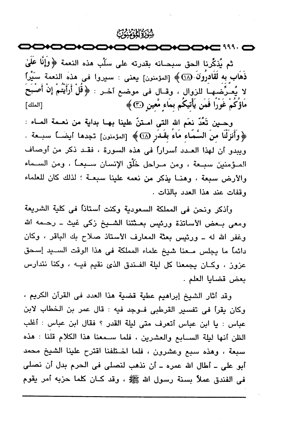 وقد أثار الشيخ إبراهيم عطية قضية هذا العدد في القرآن الكريم، وكان يقرأ في تفسير القرطبي فوجد فيه: قال عمر بن الخطاب لابن عباس: يا ابن عباس أتعرف متى ليلة القدر؟ فقال ابن عباس: أغلب الظن أنها ليلة السابع والعشرين، فلما سمعنا هذا الكلام قلنا: هذه سبعة، وهذه سبع وعشرون، فلما اختلفنا اقترح علينا الشيخ محمد أبو علي - أطال الله عمره - أن نذهب لنصلي في الحرم بدل أن نصلي في الفندق عملاً بسنة رسول الله صَلَّى اللَّهُ عَلَيْهِ وَسَلَّم َ، وقد كان كلما حزبه أمر يقوم