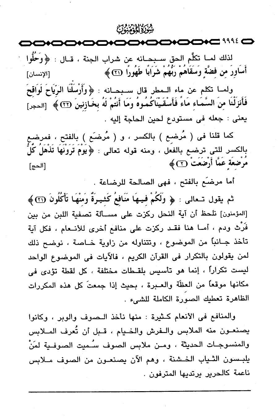 ثم يقول تعالى: {وَلَكُمْ فيِهَا مَنَافِعُ كَثِيرَةٌ وَمِنْهَا تَأْكُلُونَ} [المؤمنون: 21] نلحظ أن آية النحل ركزت على مسألة تصفية اللبن من بين فَرْث ودم، أما هنا فقد ركزت على منافع أخرى للأنعام، فكل آية تأخذ جانباً من الموضوع، وتتناوله من زاوية خاصة، نوضح ذلك لمن يقولون بالتكرار في القرآن الكريم، فالآيات في الموضوع الواحد ليست تكراراً، إنما هو تأسيس بلقطات مختلفة، كل لقطة تؤدي في مكانها موقعاً من العِظَة والعبرة، بحيث إذا جمعتَ كل هذه المكررات الظاهرة تعطيك الصورة الكاملة للشيء.