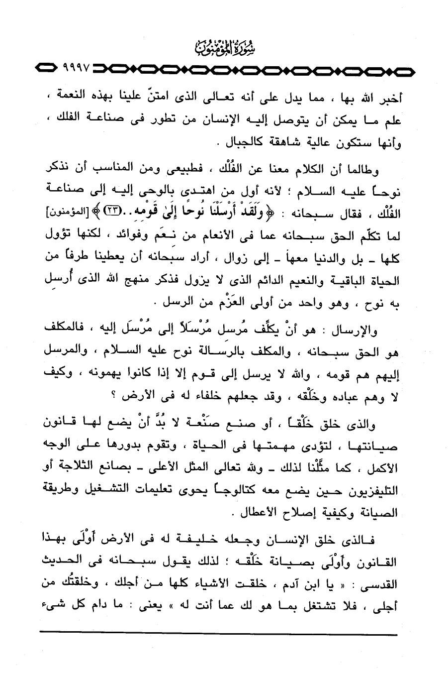 وطالما أن الكلام معنا عن الفُلْك، فطبيعي ومن المناسب أن نذكر نوحاً عليه السلام؛ لأنه أول من اهتدى بالوحي إليه إلى صناعة الفُلْك، فقال سبحانه: {وَلَقَدْ أَرْسَلْنَا نُوحاً إلى قَوْمِهِ. .} [المؤمنون: 23] لما تكلم الحق سبحانه عما في الأنعام من نِعَم وفوائد، لكنها تؤول كلها - بل والدنيا معها - إلى زوال، أراد سبحانه أن يعطينا طرفاً من الحياة الباقية والنعيم الدائم الذي لا يزول فذكر منهج الله الذي أُرسِل به نوح، وهو واحد من أولى العَزْم من الرسل.