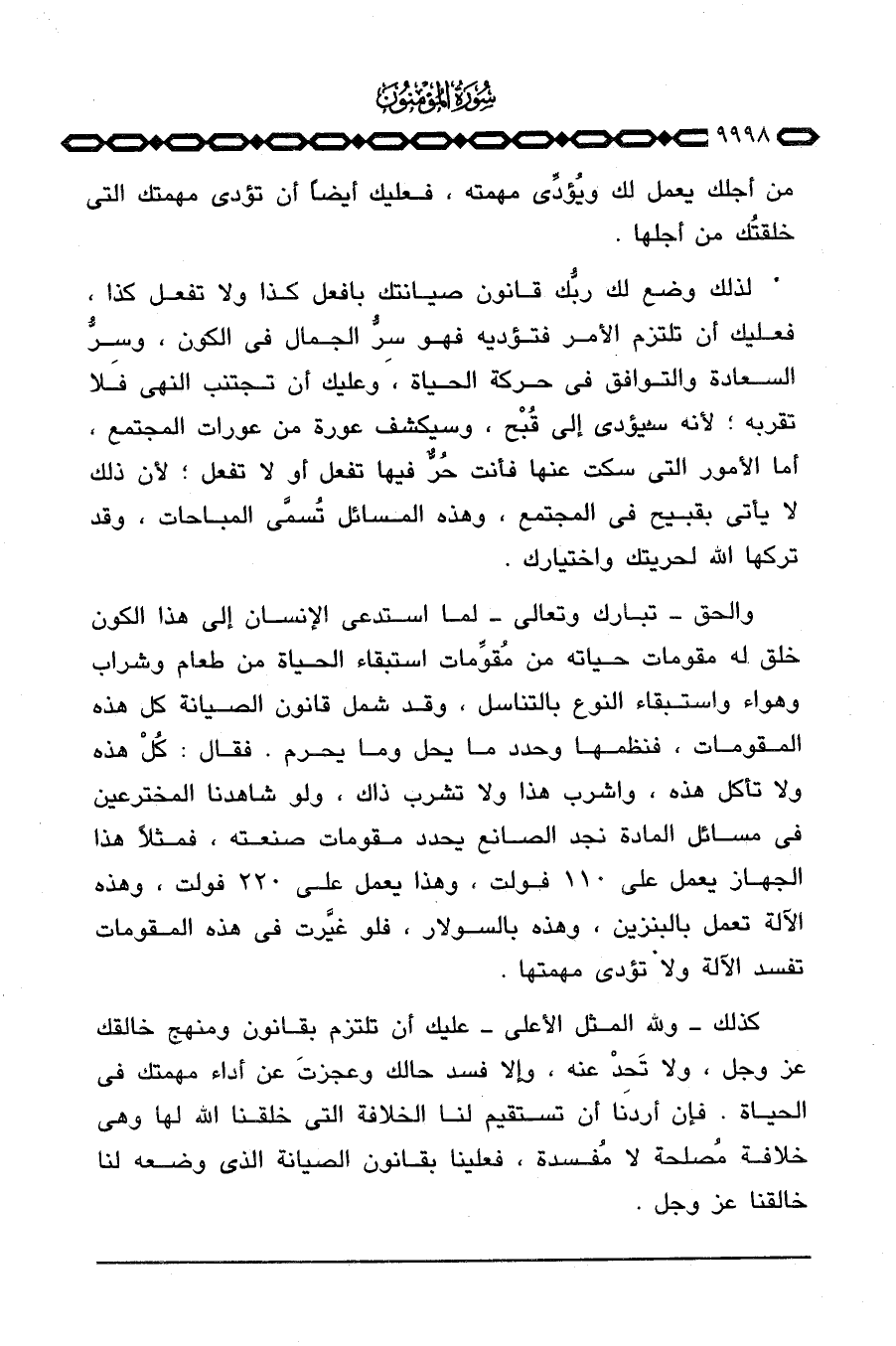 كذلك - ولله المثل الأعلى - عليك أن تلتزم بقانون ومنهج خالقك عَزَّ وَجَلَّ، ولا تَحِدْ عنه، وإلا فسد حالك وعجزتَ عن أداء مهمتك في الحياة. فإن أردنا أن تستقيم لنا الخلافة التي خلقنا الله لها وهي خلافة مُصلحة لا مُفسدة، فعلينا بقانون الصيانة الذي وضعه لنا خالقنا عَزَّ وَجَلَّ.