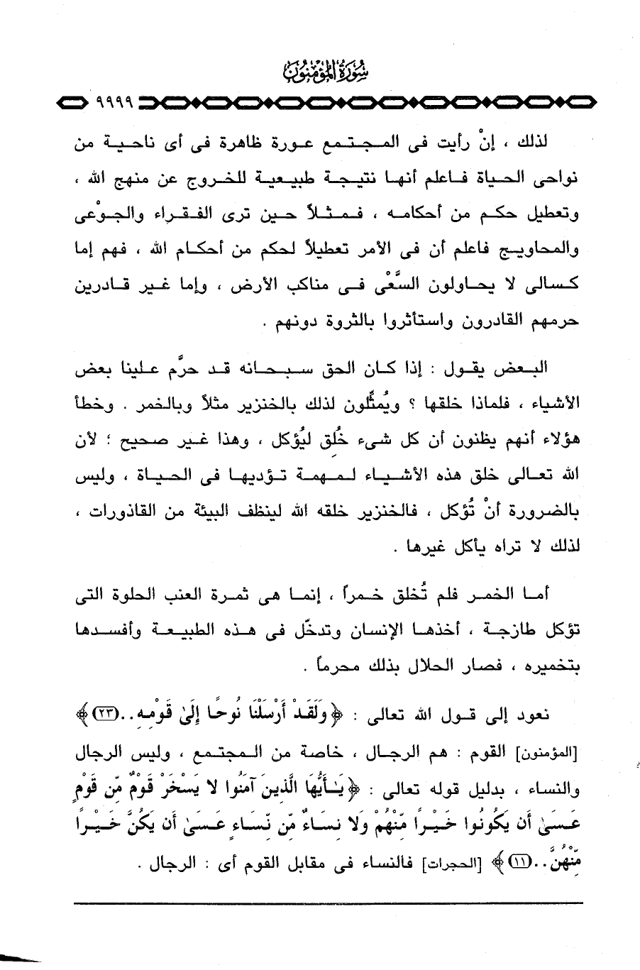 نعود إلى قول الله تعالى: {وَلَقَدْ أَرْسَلْنَا نُوحاً إلى قَوْمِهِ} [المؤمنون: 23] القوم: هم الرجال، خاصة من المجتمع، وليس الرجال والنساء، بدليل قوله تعالى: {ياأيها الذين آمَنُواْ لاَ يَسْخَرْ قَوْمٌ مِّن قَوْمٍ عسى أَن يَكُونُواْ خَيْراً مِّنْهُمْ وَلاَ نِسَآءٌ مِّن نِّسَآءٍ عسى أَن يَكُنَّ خَيْراً مِّنْهُنَّ. .} [الحجرات: 11] فالنساء في مقابل القوم أي: الرجال.