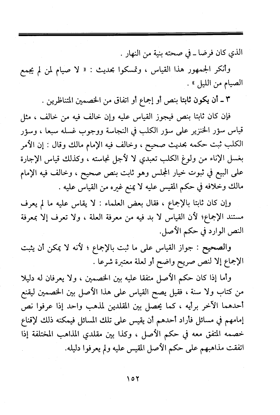 فإن كان ثابتا بنص فيجوز القياس عليه وإن خالف فيه من خالف، مثل قياس سؤر الخنزير على سؤر الكلب في النجاسة ووجوب غسله سبعا، وسؤر الكلب ثبت حكمه بحديث صحيح، وخالف فيه الإمام مالك وقال: إن الأمر بغسل الإناء من ولوغ الكلب تعبدي لا لأجل نجاسته، وكذلك قياس الإجارة على البيع في ثبوت خيار المجلس وهو ثابت بنص صحيح، وخالف فيه الإمام مالك وخلافه في حكم المقيس عليه لا يمنع غيره من القياس عليه.