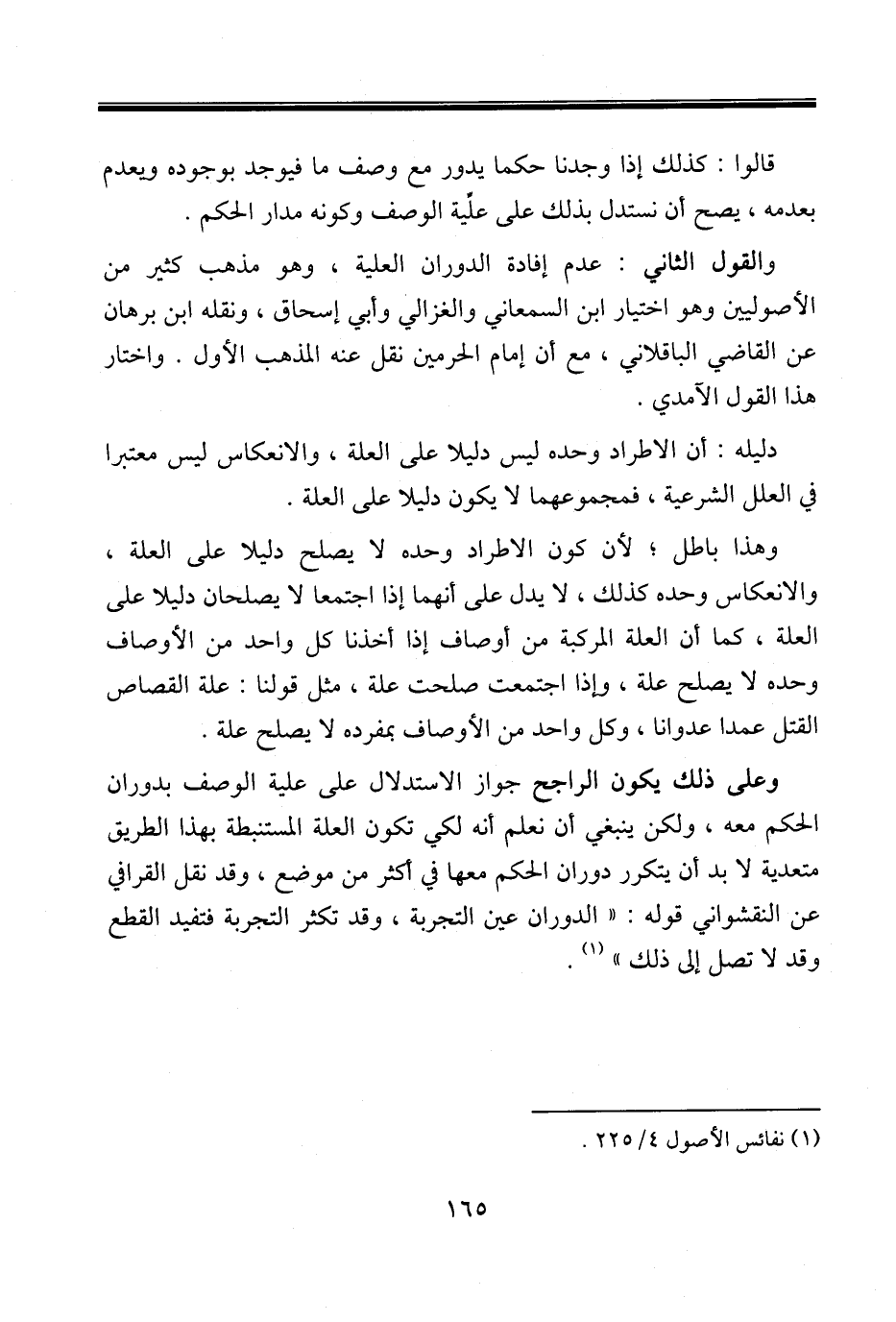 وعلى ذلك يكون الراجح جواز الاستدلال على علية الوصف بدوران الحكم معه، ولكن ينبغي أن نعلم أنه لكي تكون العلة المستنبطة بهذا الطريق متعدية لا بد أن يتكرر دوران الحكم معها في أكثر من موضع، وقد نقل القرافي عن النقشواني قوله: «الدوران عين التجربة، وقد تكثر التجربة فتفيد القطع وقد لا تصل إلى ذلك» (¬1).