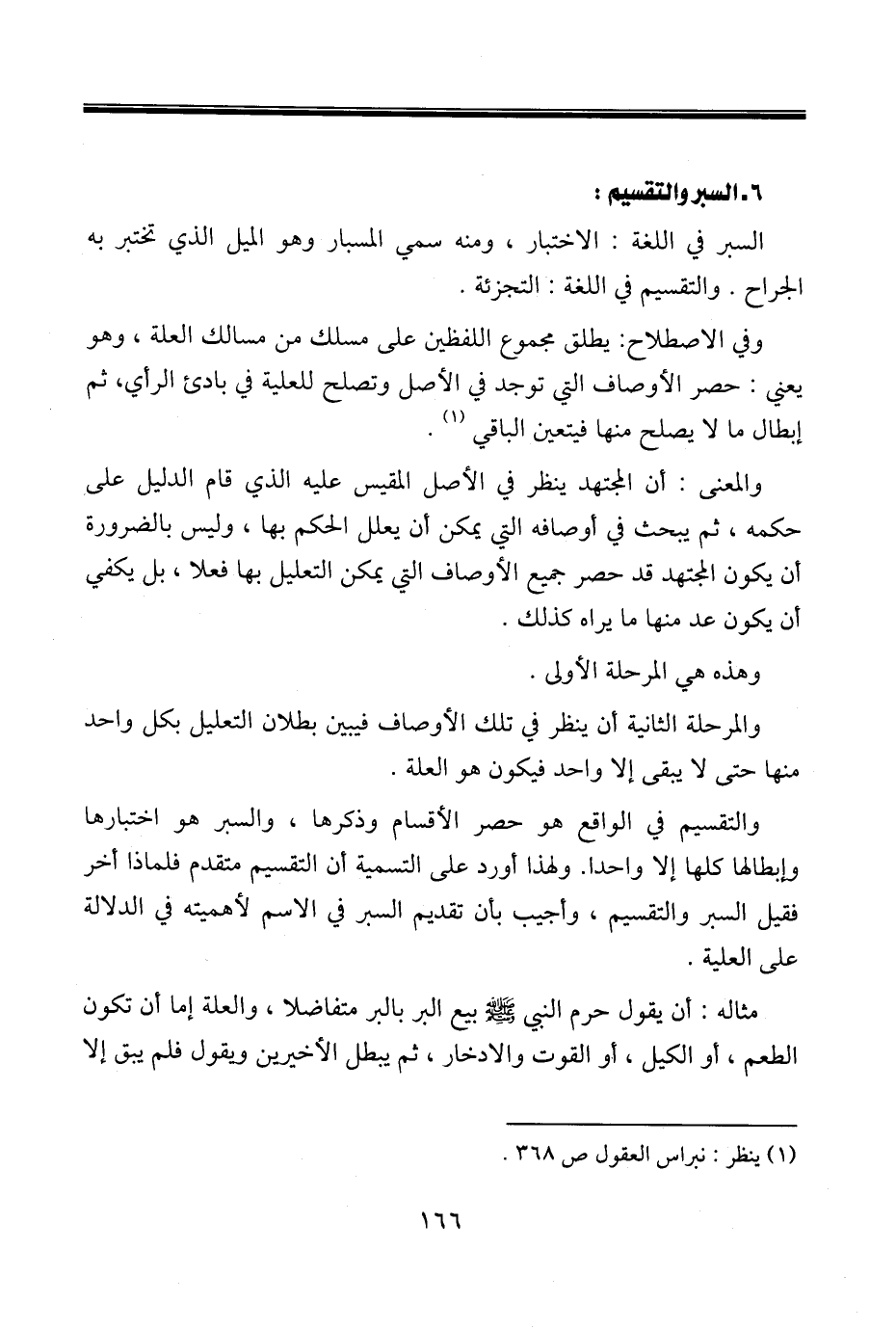 مثاله: أن يقول حرم النبي صلى الله عليه وسلم بيع البر بالبر متفاضلا، والعلة إما أن تكون الطعم، أو الكيل، أو القوت والادخار، ثم يبطل الأخيرين ويقول فلم يبق إلا