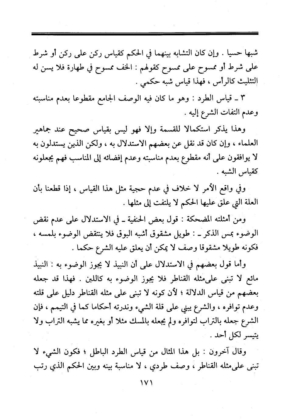 وقال آخرون: بل هذا المثال من قياس الطرد الباطل؛ فكون الشيء لا تبنى علىمثله القناطر، وصف طردي، لا مناسبة بينه وبين الحكم الذي رتب