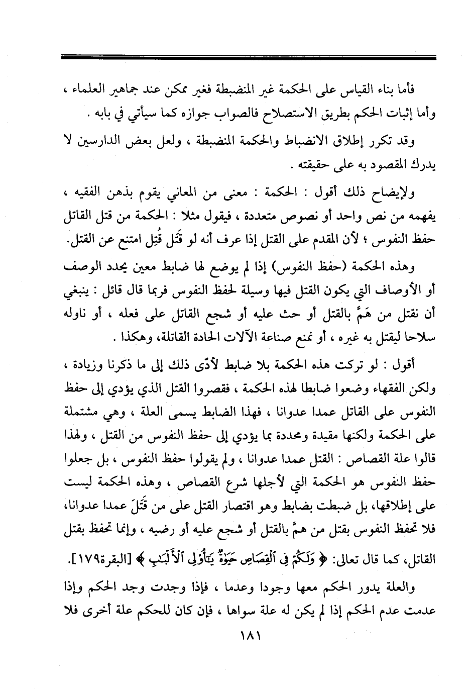 أقول: لو تركت هذه الحكمة بلا ضابط لأدّى ذلك إلى ما ذكرنا وزيادة، ولكن الفقهاء وضعوا ضابطا لهذه الحكمة، فقصروا القتل الذي يؤدي إلى حفظ النفوس على القاتل عمدا عدوانا، فهذا الضابط يسمى العلة، وهي مشتملة على الحكمة ولكنها مقيدة ومحددة بما يؤدي إلى حفظ النفوس من القتل، ولهذا قالوا علة القصاص: القتل عمدا عدوانا، ولم يقولوا حفظ النفوس، بل جعلوا حفظ النفوس هو الحكمة التي لأجلها شرع القصاص، وهذه الحكمة ليست على إطلاقها، بل ضبطت بضابط وهو اقتصار القتل على من قَتَلَ عمدا عدوانا، فلا تحفظ النفوس بقتل من همَّ بالقتل أو شجع عليه أو رضيه، وإنما تحفظ بقتل القاتل، كما قال تعالى: {وَلَكُمْ فِي الْقِصَاصِ حَيَاةٌ يَا أُولِي الْأَلْبَابِ} [البقرة179].