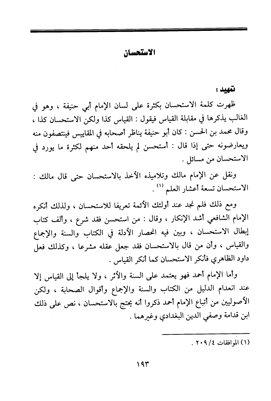 ومع ذلك فلم نجد عند أولئك الأئمة تعريفا للاستحسان، ولذلك أنكره الإمام الشافعي أشد الإنكار، وقال: من استحسن فقد شرع، وألف كتاب إبطال الاستحسان، وبين فيه انحصار الأدلة في الكتاب والسنة والإجماع والقياس، وأن من قال بالاستحسان فقد جعل عقله مشرعا، وكذلك فعل داود الظاهري فأنكر الاستحسان كما أنكر القياس.