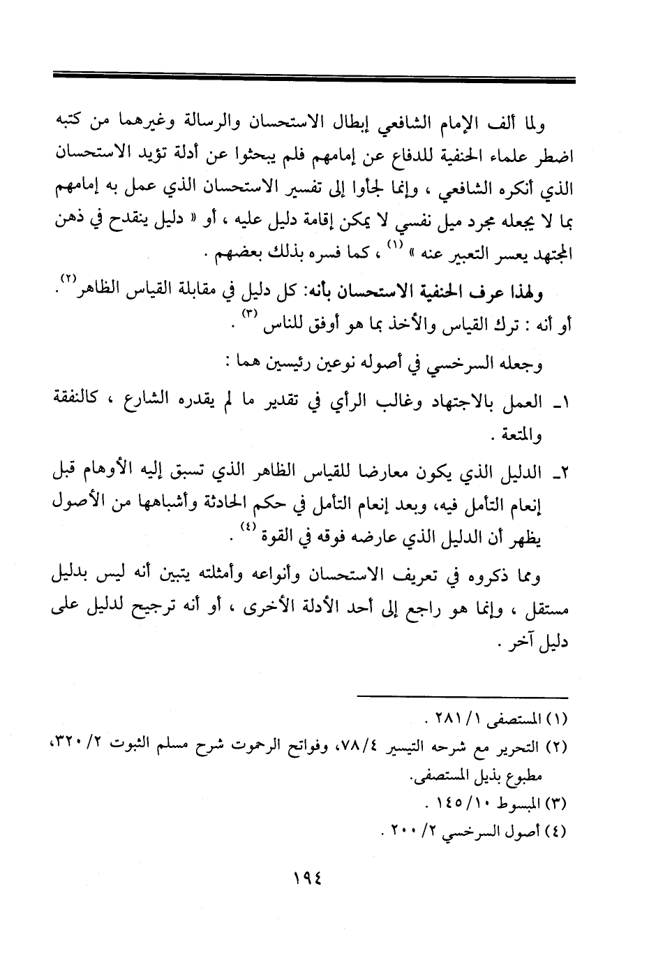 ولما ألف الإمام الشافعي إبطال الاستحسان والرسالة وغيرهما من كتبه اضطر علماء الحنفية للدفاع عن إمامهم فلم يبحثوا عن أدلة تؤيد الاستحسان الذي أنكره الشافعي، وإنما لجأوا إلى تفسير الاستحسان الذي عمل به إمامهم بما لا يجعله مجرد ميل نفسي لا يمكن إقامة دليل عليه، أو «دليل ينقدح في ذهن المجتهد يعسر التعبير عنه» (¬1)، كما فسره بذلك بعضهم.