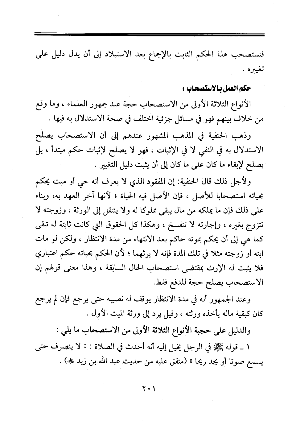 ولأجل ذلك قال الحنفية: إن المفقود الذي لا يعرف أنه حي أو ميت يحكم بحياته استصحابا للأصل، فإن الأصل فيه الحياة؛ لأنها آخر العهد به، وبناء على ذلك فإن ما يملكه من مال يبقى مملوكا له ولا ينتقل إلى الورثة، وزوجته لا تتزوج بغيره، وإجارته لا تنفسخ، وهكذا كل الحقوق التي كانت ثابتة له تبقى كما هي إلى أن يحكم بموته حاكم بعد الانتهاء من مدة الانتظار، ولكن لو مات ابنه أو زوجته مثلا في تلك المدة فإنه لا يرثهما؛ لأن الحكم بحياته حكم اعتباري فلا يثبت له الإرث بمقتضى استصحاب الحال السابقة، وهذا معنى قولهم إن الاستصحاب يصلح حجة للدفع فقط.
