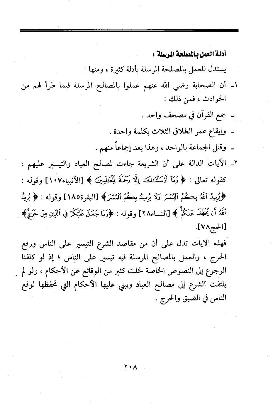 فهذه الايات تدل على أن من مقاصد الشرع التيسير على الناس ورفع الحرج، والعمل بالمصالح المرسلة فيه تيسير على الناس؛ إذ لو كلفنا الرجوع إلى النصوص الخاصة لخلت كثير من الوقائع عن الأحكام، ولو لم يلتفت الشرع إلى مصالح العباد ويبني عليها الأحكام التي تحفظها لوقع الناس في الضيق والحرج.