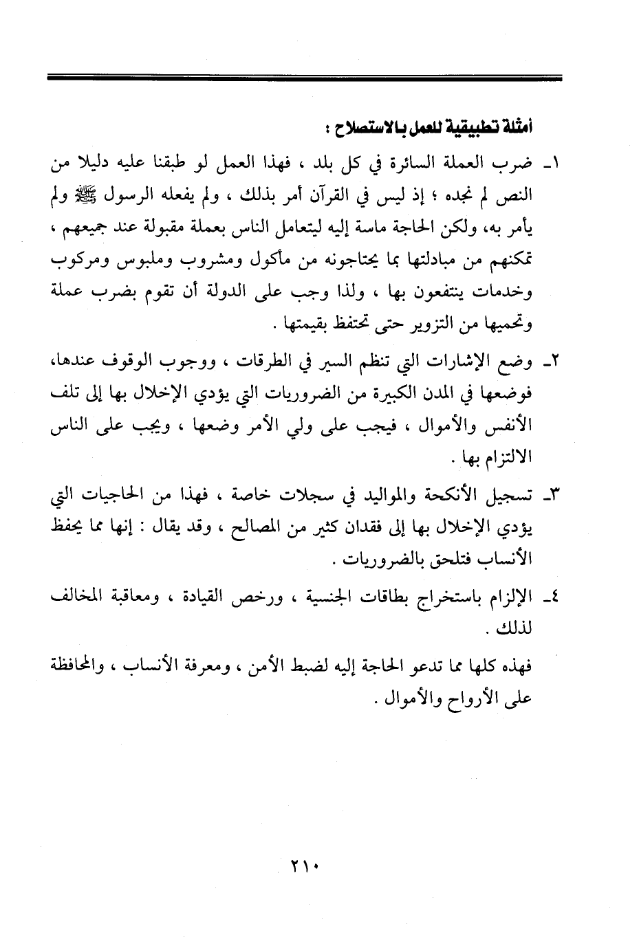 1 - ضرب العملة السائرة في كل بلد، فهذا العمل لو طبقنا عليه دليلا من النص لم نجده؛ إذ ليس في القرآن أمر بذلك، ولم يفعله الرسول صلى الله عليه وسلم ولم يأمر به، ولكن الحاجة ماسة إليه ليتعامل الناس بعملة مقبولة عند جميعهم، تمكنهم من مبادلتها بما يحتاجونه من مأكول ومشروب وملبوس ومركوب وخدمات ينتفعون بها، ولذا وجب على الدولة أن تقوم بضرب عملة وتحميها من التزوير حتى تحتفظ بقيمتها.