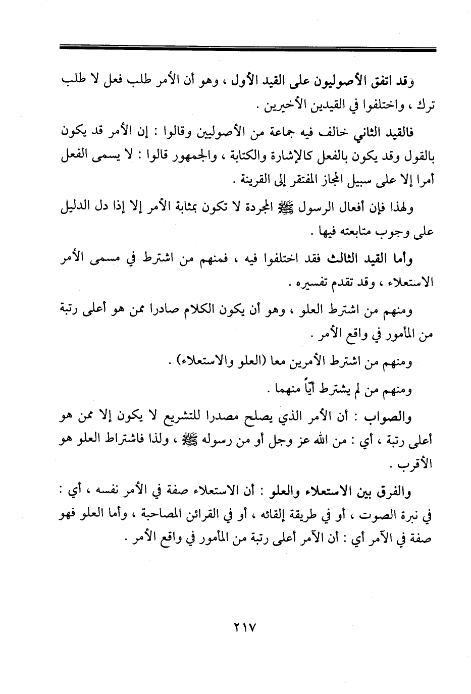 وقد اتفق الأصوليون على القيد الأول، وهو أن الأمر طلب فعل لا طلب ترك، واختلفوا في القيدين الأخيرين.
