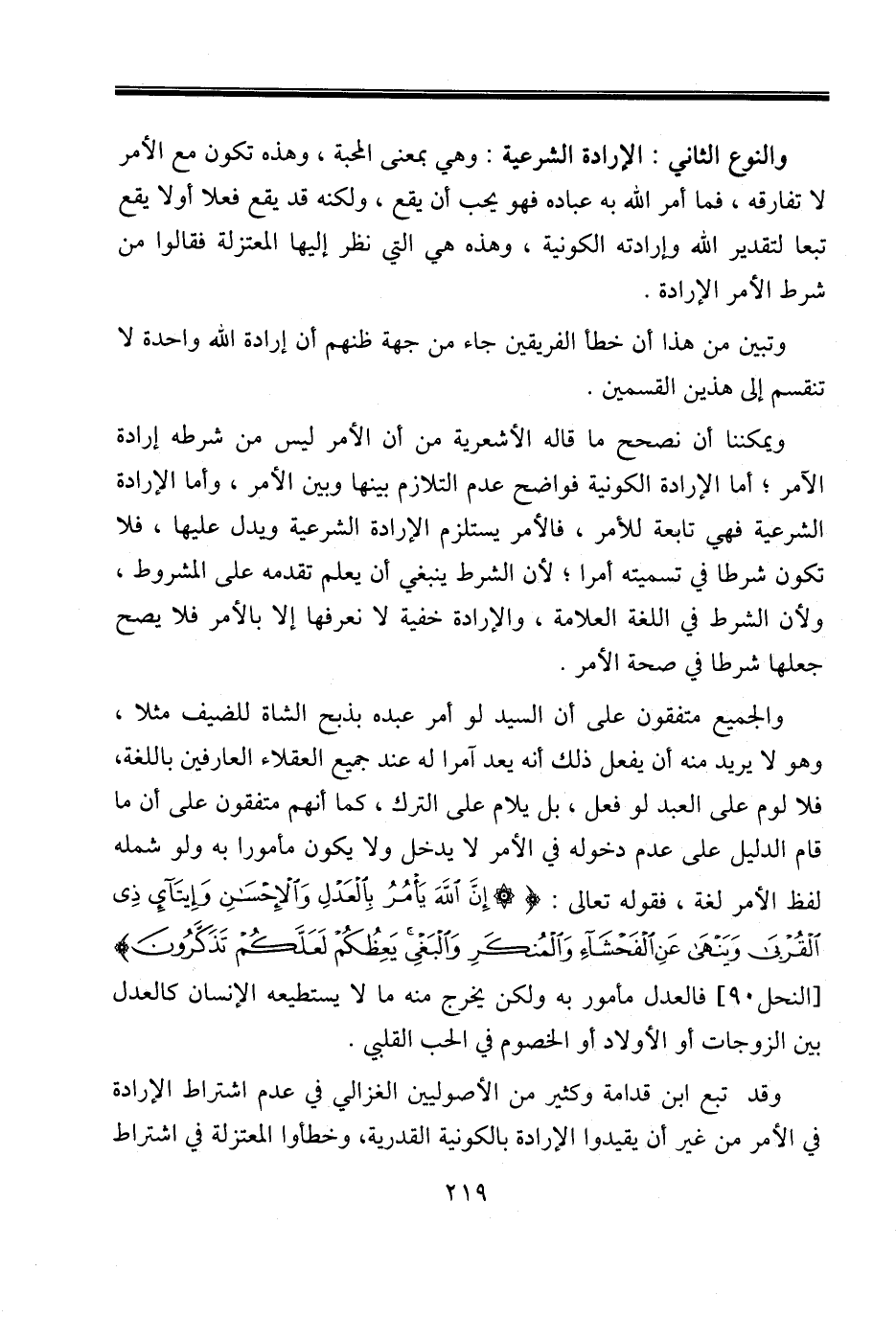 والنوع الثاني: الإرادة الشرعية: وهي بمعنى المحبة، وهذه تكون مع الأمر لا تفارقه، فما أمر الله به عباده فهو يحب أن يقع، ولكنه قد يقع فعلا أولا يقع تبعا لتقدير الله وإرادته الكونية، وهذه هي التي نظر إليها المعتزلة فقالوا من شرط الأمر الإرادة.