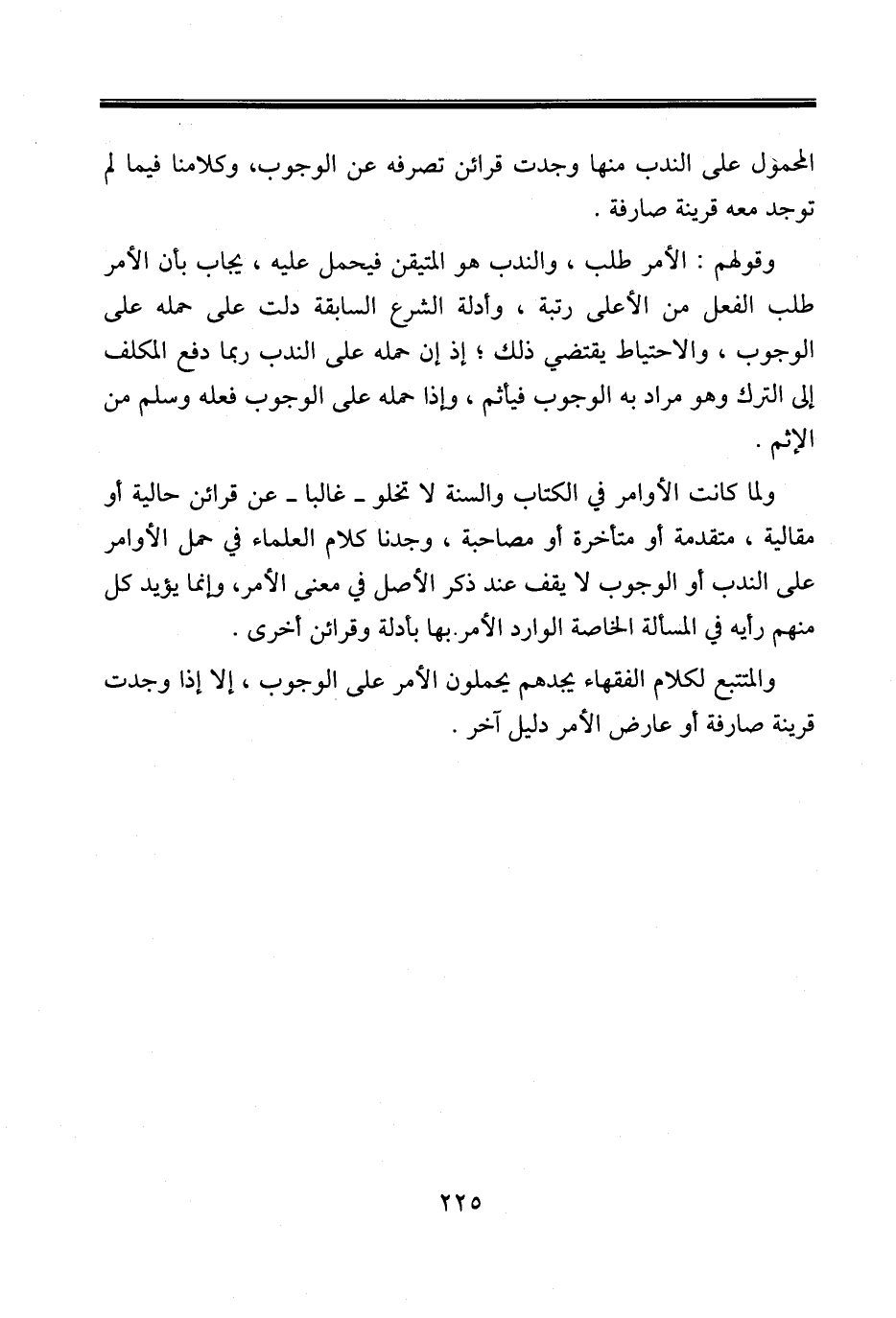 ولما كانت الأوامر في الكتاب والسنة لا تخلو ـ غالبا ـ عن قرائن حالية أو مقالية، متقدمة أو متأخرة أو مصاحبة، وجدنا كلام العلماء في حمل الأوامر على الندب أو الوجوب لا يقف عند ذكر الأصل في معنى الأمر، وإنما يؤيد كل منهم رأيه في المسألة الخاصة الوارد الأمر بها بأدلة وقرائن أخرى.