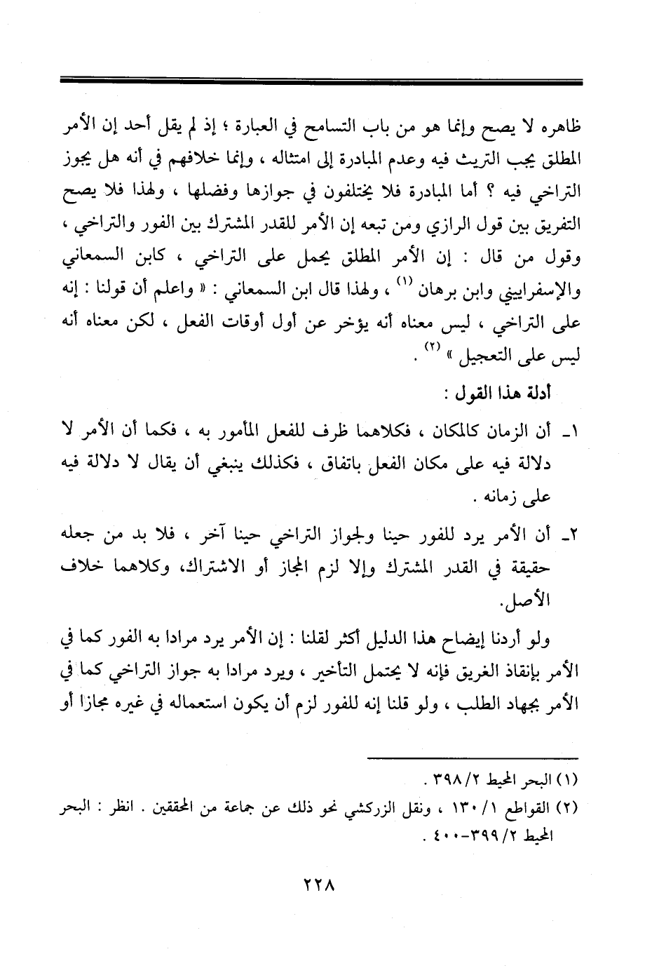 ظاهره لا يصح وإنما هو من باب التسامح في العبارة؛ إذ لم يقل أحد إن الأمر المطلق يجب التريث فيه وعدم المبادرة إلى امتثاله، وإنما خلافهم في أنه هل يجوز التراخي فيه؟ أما المبادرة فلا يختلفون في جوازها وفضلها، ولهذا فلا يصح التفريق بين قول الرازي ومن تبعه إن الأمر للقدر المشترك بين الفور والتراخي، وقول من قال: إن الأمر المطلق يحمل على التراخي، كابن السمعاني والإسفراييني وابن برهان (¬1)، ولهذا قال ابن السمعاني: «واعلم أن قولنا: إنه على التراخي، ليس معناه أنه يؤخر عن أول أوقات الفعل، لكن معناه أنه ليس على التعجيل» (¬2).