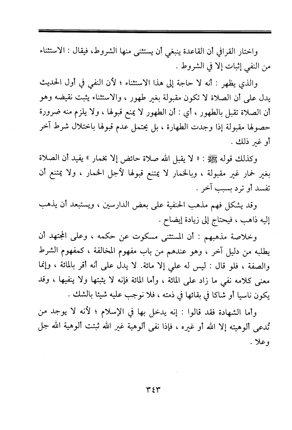 واختار القرافي أن القاعدة ينبغي أن يستثنى منها الشروط، فيقال: الاستثناء من النفي إثبات إلا في الشروط.