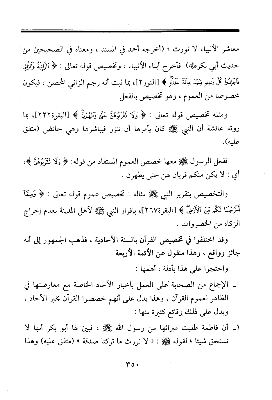 معاشر الأنبياء لا نورث» (أخرجه أحمد في المسند، ومعناه في الصحيحين من حديث أبي بكر - رضي الله عنه -) فأخرج أبناء الأنبياء، وتخصيص قوله تعالى: {الزَّانِيَةُ وَالزَّانِي فَاجْلِدُوا كُلَّ وَاحِدٍ مِنْهُمَا مِائَةَ جَلْدَةٍ} [النور2]، بما ثبت أنه رجم الزاني المحصن، فيكون مخصوصا من العموم، وهو تخصيص بالفعل.
