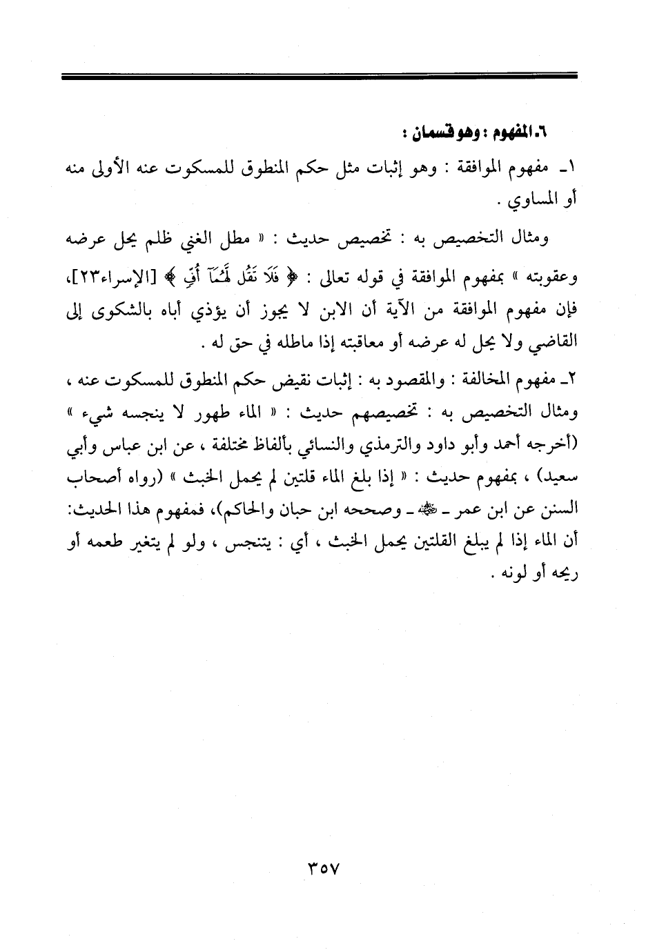 2ـ مفهوم المخالفة: والمقصود به: إثبات نقيض حكم المنطوق للمسكوت عنه، ومثال التخصيص به: تخصيصهم حديث: «الماء طهور لا ينجسه شيء» (أخرجه أحمد وأبو داود والترمذي والنسائي بألفاظ مختلفة، عن ابن عباس وأبي سعيد)، بمفهوم حديث: «إذا بلغ الماء قلتين لم يحمل الخبث» (رواه أصحاب السنن عن ابن عمر ـ - رضي الله عنه - ـ وصححه ابن حبان والحاكم)، فمفهوم هذا الحديث: أن الماء إذا لم يبلغ القلتين يحمل الخبث، أي: يتنجس، ولو لم يتغير طعمه أو ريحه أو لونه.