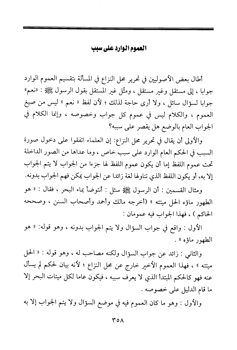 والثاني: زائد عن جواب السؤال ولكنه مصاحب له، وهو قوله: «الحل ميتته»، فهذا العموم الأخير خارج عن محل النزاع؛ لأنه بيان لحكم لم يسأل عنه فهو كالحكم المبتدأ الذي لا يعرف سببه، فيكون عاما لكل ميتات البحر إلا ما قام الدليل على خصوصه.