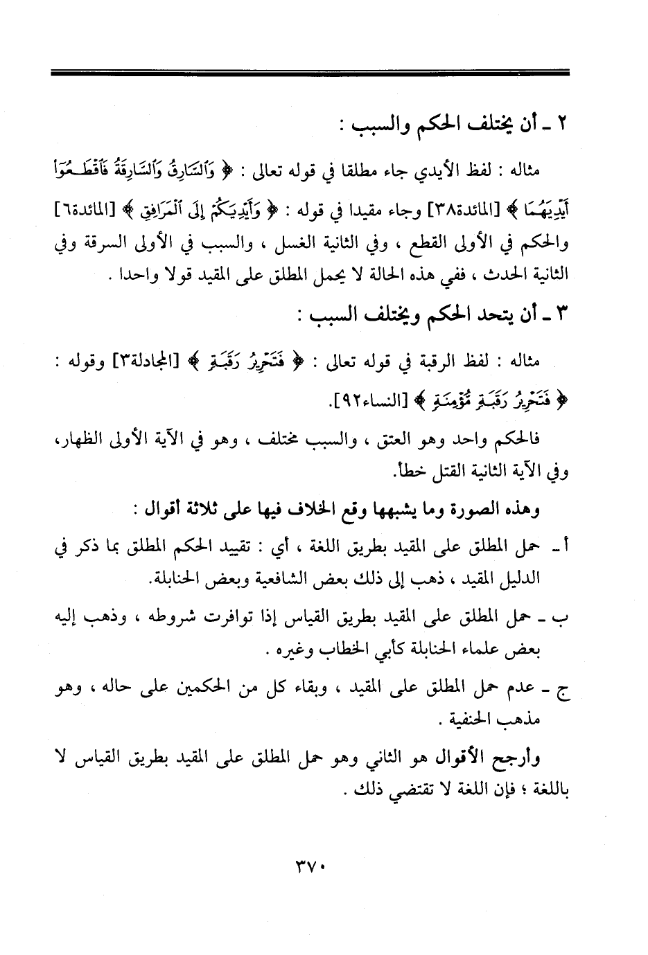مثاله: لفظ الأيدي جاء مطلقا في قوله تعالى: {وَالسَّارِقُ وَالسَّارِقَةُ فَاقْطَعُوا أَيْدِيَهُمَا} [المائدة38] وجاء مقيدا في قوله: {وَأَيْدِيَكُمْ إِلَى الْمَرَافِقِ} [المائدة6] والحكم في الأولى القطع، وفي الثانية الغسل، والسبب في الأولى السرقة وفي الثانية الحدث، ففي هذه الحالة لا يحمل المطلق على المقيد قولا واحدا.