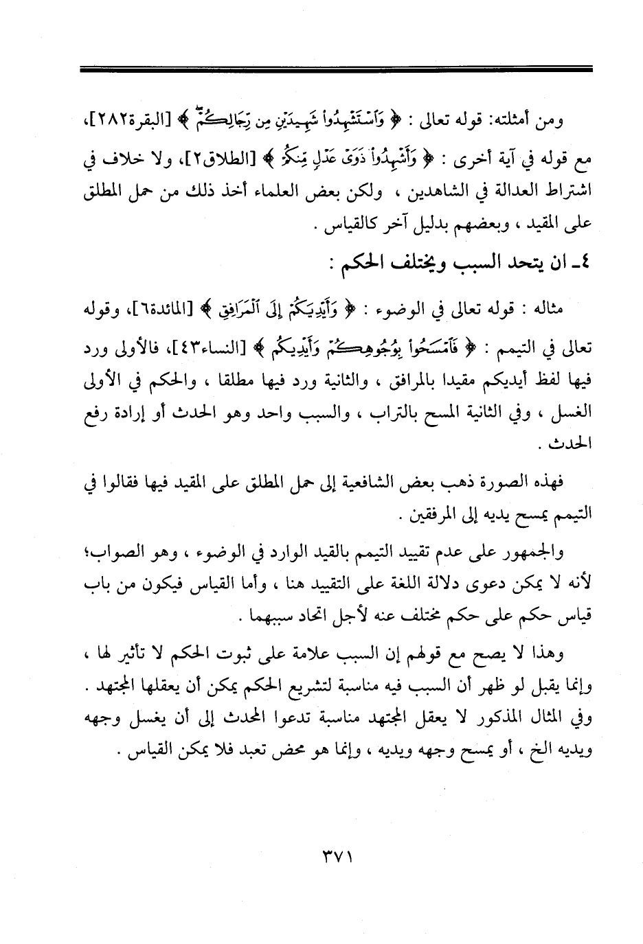 وهذا لا يصح مع قولهم إن السبب علامة على ثبوت الحكم لا تأثير لها، وإنما يقبل لو ظهر أن السبب فيه مناسبة لتشريع الحكم يمكن أن يعقلها المجتهد. وفي المثال المذكور لا يعقل المجتهد مناسبة تدعوا المحدث إلى أن يغسل وجهه ويديه الخ، أو يمسح وجهه ويديه، وإنما هو محض تعبد فلا يمكن القياس.